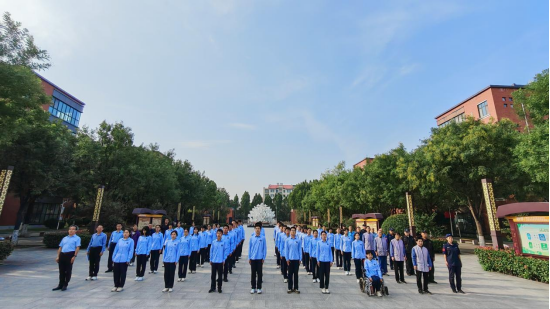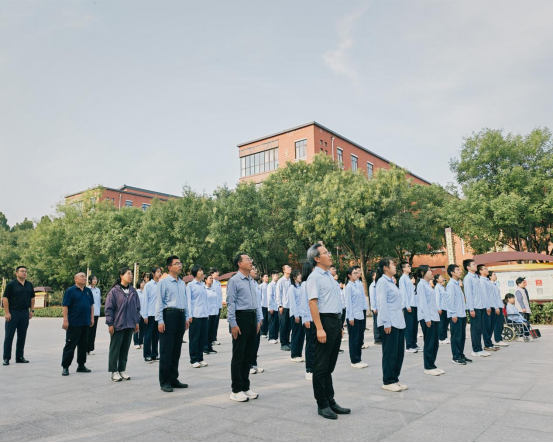 当雄壮的《义勇军进行曲》奏响,鲜艳的五星红旗迎着秋风冉冉升起,全场人员肃立行注目礼,目光追随着国旗攀升的轨迹。嘹亮的歌声回荡在校园上空,每一个音符都承载着对祖国的赤诚与热爱,每一次抬头都饱含着对国家繁荣昌盛的祝福。晨光中,国旗的红与天空的蓝交相辉映,成为校园里最动人的风景,也将爱国的种子深深播撒在每一位参与者的心中。
