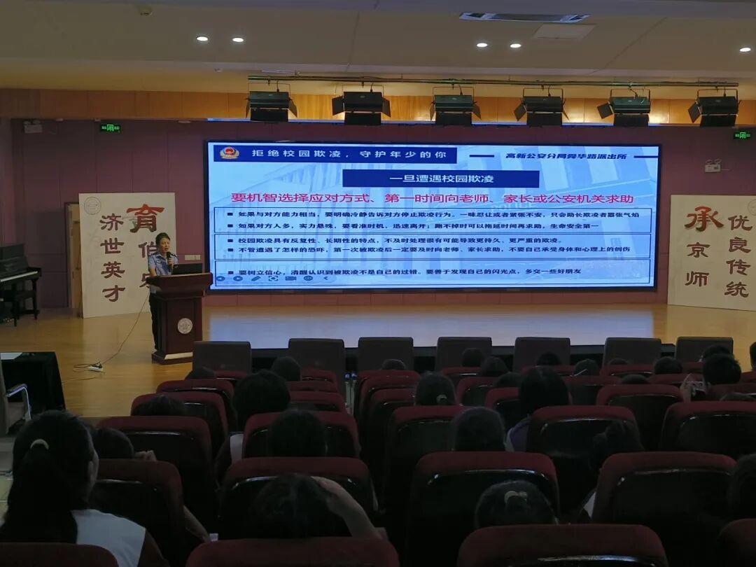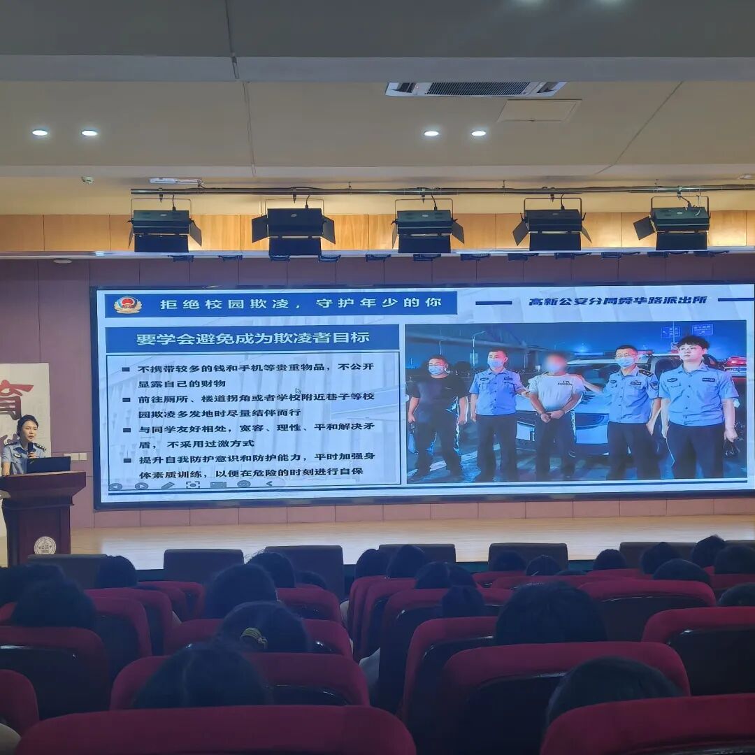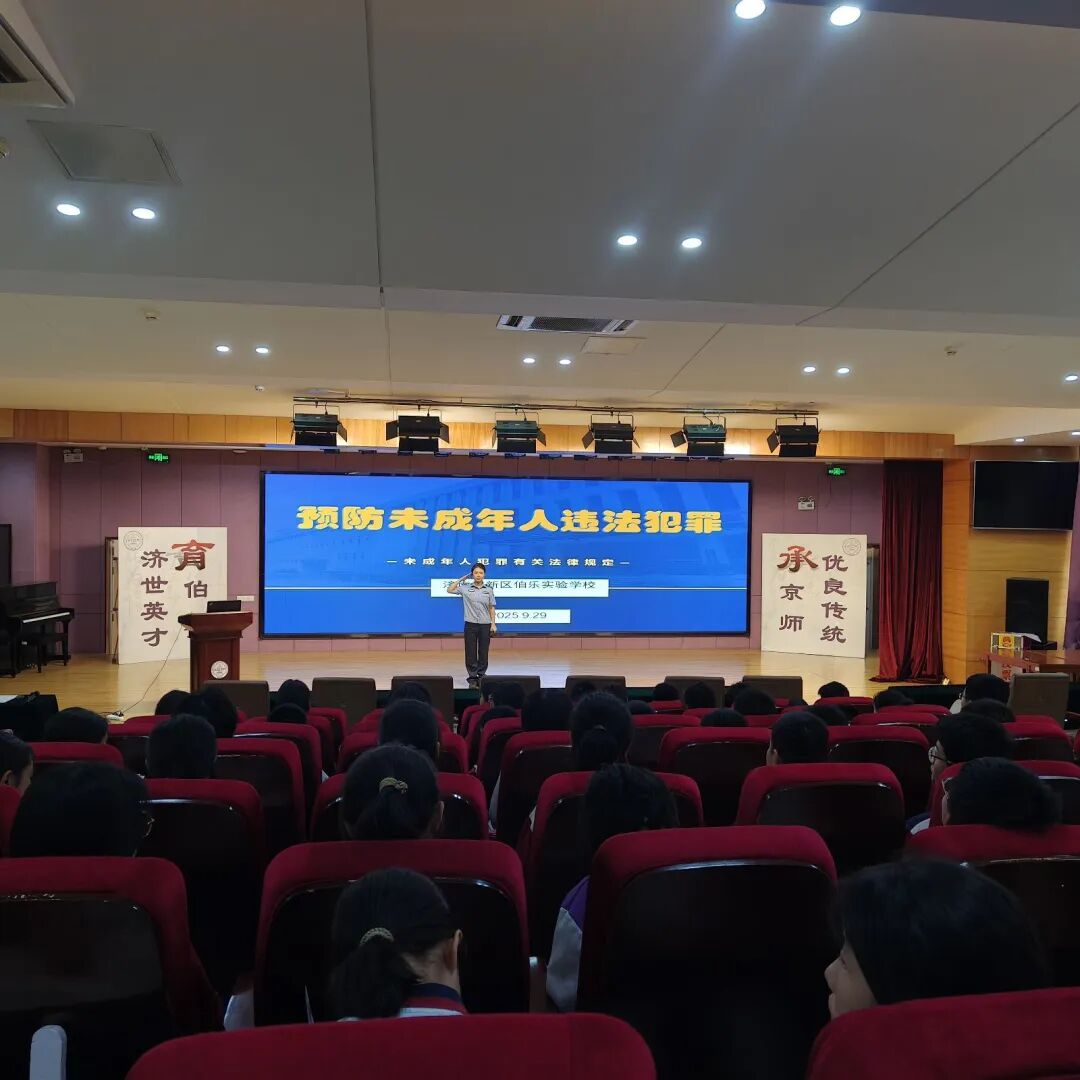 为了进一步增强伯乐实验学校初中生的法治观念和自我保护意识,有效预防和减少未成年人违法犯罪,营造安全、健康、和谐的校园环境,济南高新区伯乐实验学校于2025年9月29日下午,特别邀请了济南市公安局高新分局舜华路派出所的赵警官,为全体初中学生带来了一场主题鲜明、内容详实的“预防未成年人违法犯罪”专题讲座。