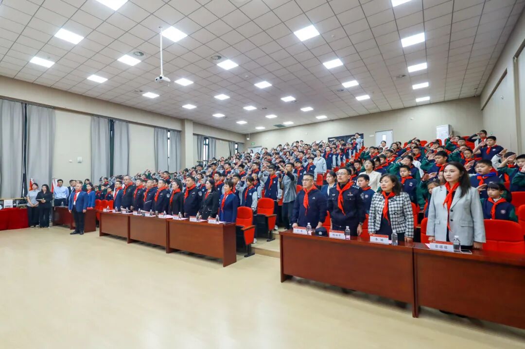副校长祁长和宣读《山东师范大学怀瑾实验学校关于成立新建中队的名单》。长清区交警大队大队长翟尚成手持鲜艳的中队旗,依次为各新建中队的学生代表授旗。
