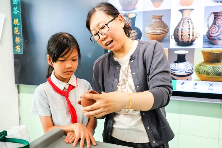 “泉城印记侦探”仔细研究不同时期的汲水器具,分析其结构特点,为设计“济南小名片”搜集素材。“陶器发明家”专注观察大汶口文化的红陶、白陶与黑陶,认真记录下陶器颜色与烧制温度的关联。“青铜裁判官”围着亚丑钺、颂簋等国之重器,对照“寻宝图”分析纹饰、猜测用途,并将神秘的青铜纹样仔细临摹下来。