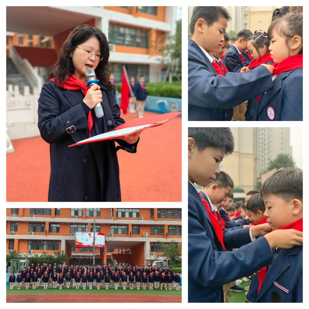 学校少工委副主任、副校长范啸宇宣读了新队员名单,并对他们表示了热烈的祝贺。五年级的少先队员们及校领导细心地为新队员们系上鲜艳的红领巾,并互致崇高的队礼。这一刻,红领巾成为了连接过去与未来的桥梁,不仅标志着新队员们身份的转变,更意味着他们肩负起了新的责任与使命。新队员们在队旗下庄严宣誓,誓言铿锵有力,表达了他们为共产主义事业而奋斗的坚定决心。