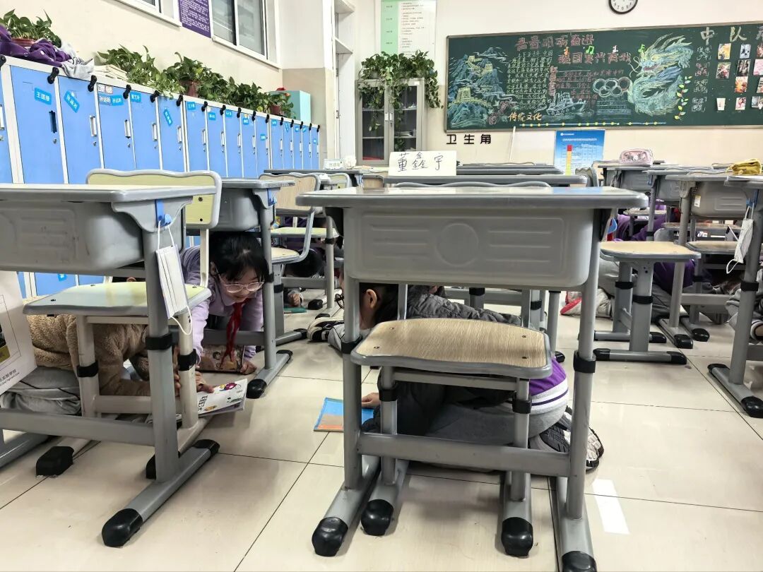 应急避震启动信号响起后,全体师生迅速进入应急状态。学生们迅速蹲在墙角及课桌下,蜷曲身体,降低身体重心,双手抱头保护头部,教师实时纠正动作。