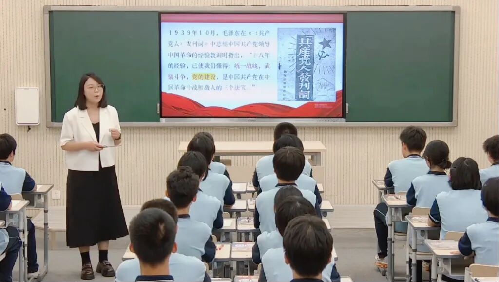 张玉蕾老师作为核心成员,提供了《“三大法宝”之党的建设》的优质课。在济南高新区历史教研员董艺老师的悉心指导下,本节课围绕“党的建设”这一主线,将“党的建设”分为三大时期,并把“霹雳一声暴动”、“亿兆一心,战则必胜”“天翻地覆慨而慷”等具有时代特征的毛泽东诗词融入教学各环节,实现“以诗串史、以史悟诗”,在诗词的韵律与意境中,帮助学生梳理党的会议发展脉络,感悟党史厚重。