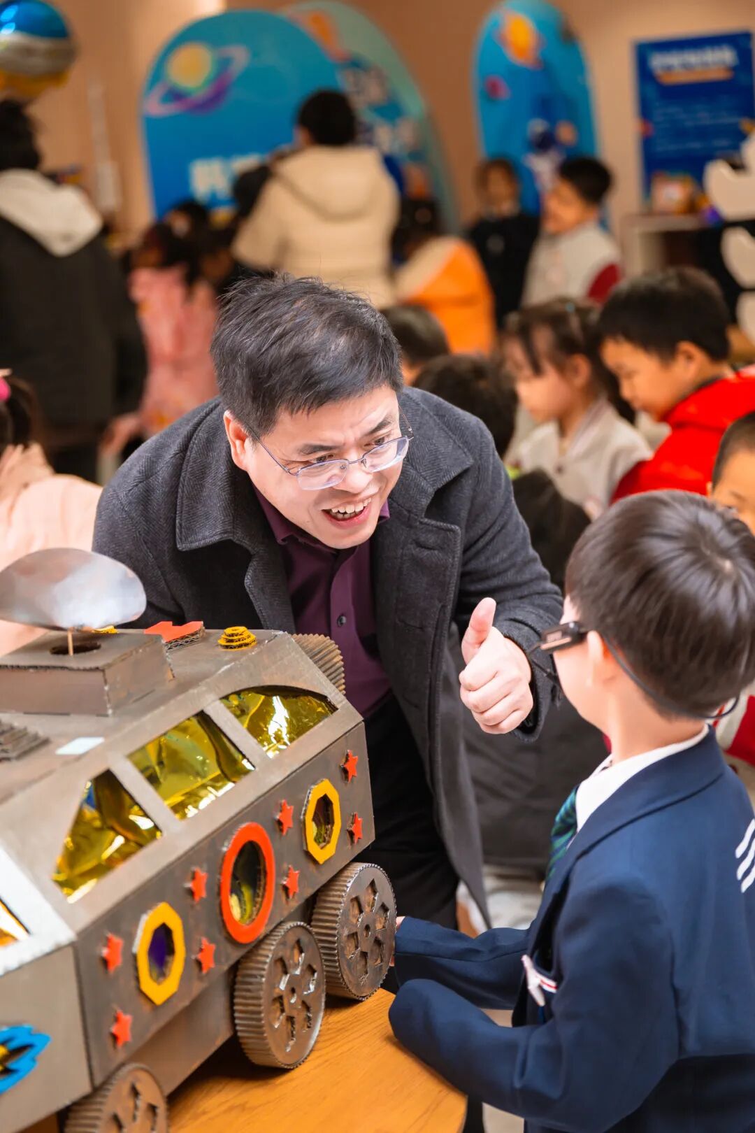 本届科技节以“科技联结你我,伙伴携手未来”为主题,精心设计了多元活动板块。热闹非凡的游园会成为全场焦点,科技作品展上,学生们带来的环保机器人、创意小发明、科学手抄报琳琅满目,每一件作品都凝聚着孩子们的奇思妙想;科技绘画展中,色彩斑斓的画作里藏着对未来科技的无限憧憬,太空城、智能家园、环保飞船等主题作品引得师生驻足称赞,大家边看边议,感受着科技与艺术的完美融合。