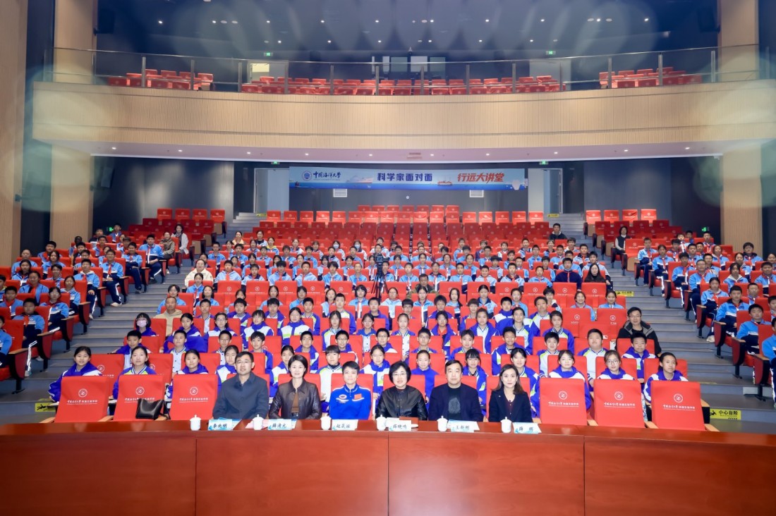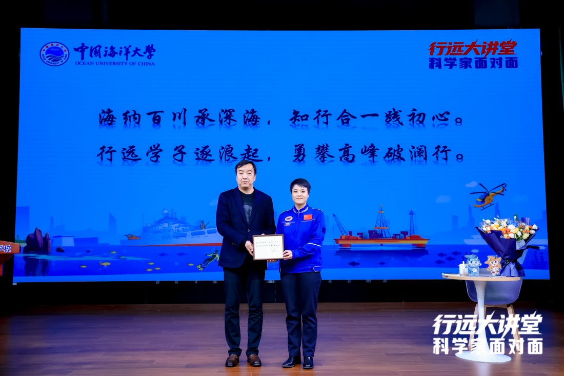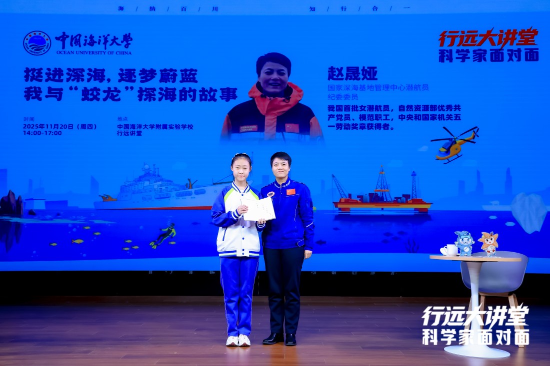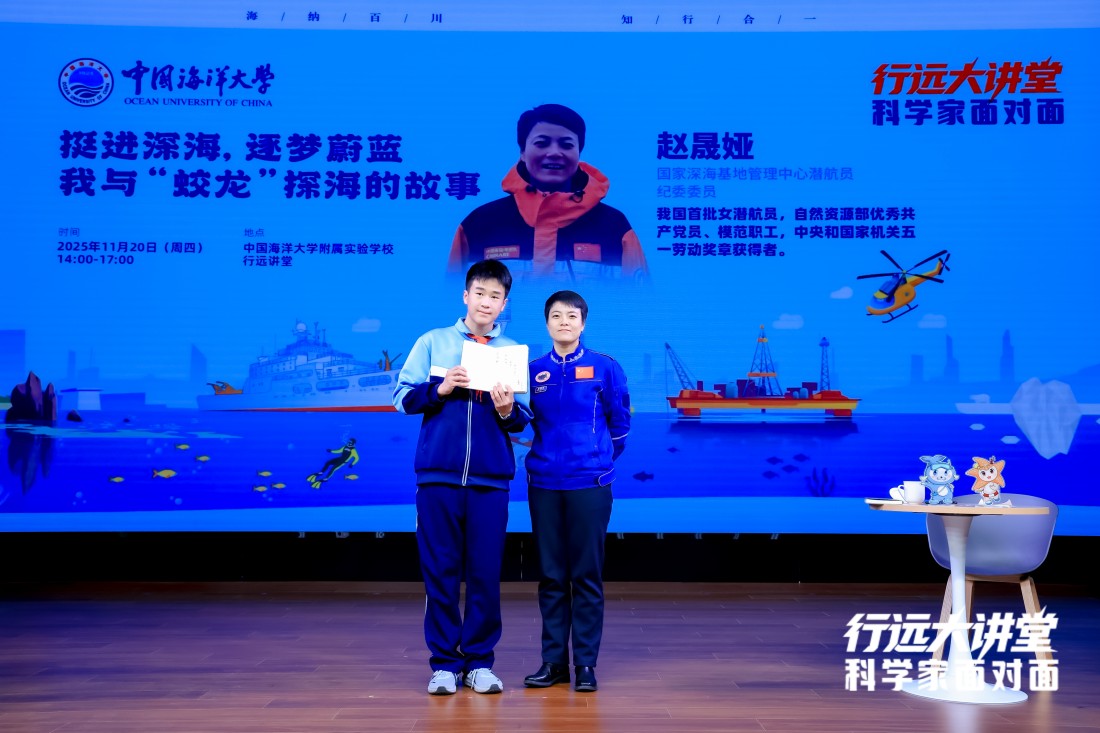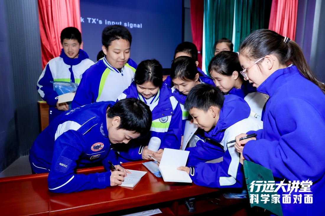 在互动环节中,中国海洋大学附属实验学校、中国海洋大学附属中学(山东省青岛第三十九中学)和县中托管学校(河南省栾川县第一高级中学、湖北省大悟县第一中学)的学生们踊跃提问,围绕深海环境、潜航装备、心理素质等话题展开交流。赵晟娅耐心作答,并为提问的学生在签名簿上亲笔留言,勉励大家保持好奇心与探索精神,把“深海梦”化为“强国志”。