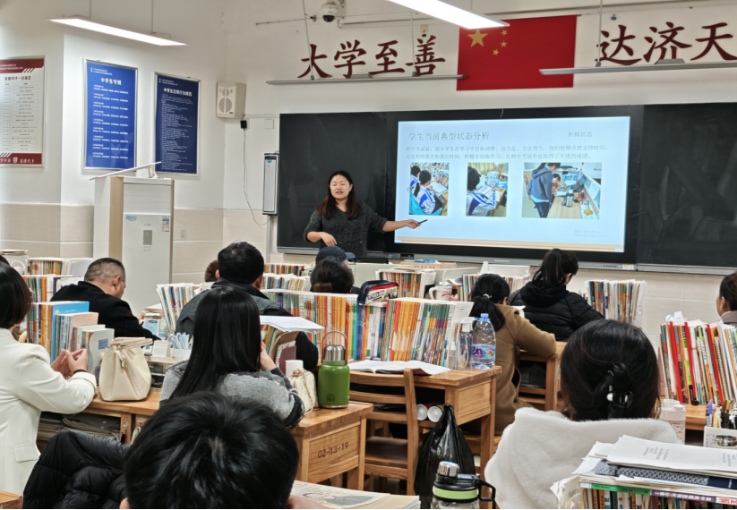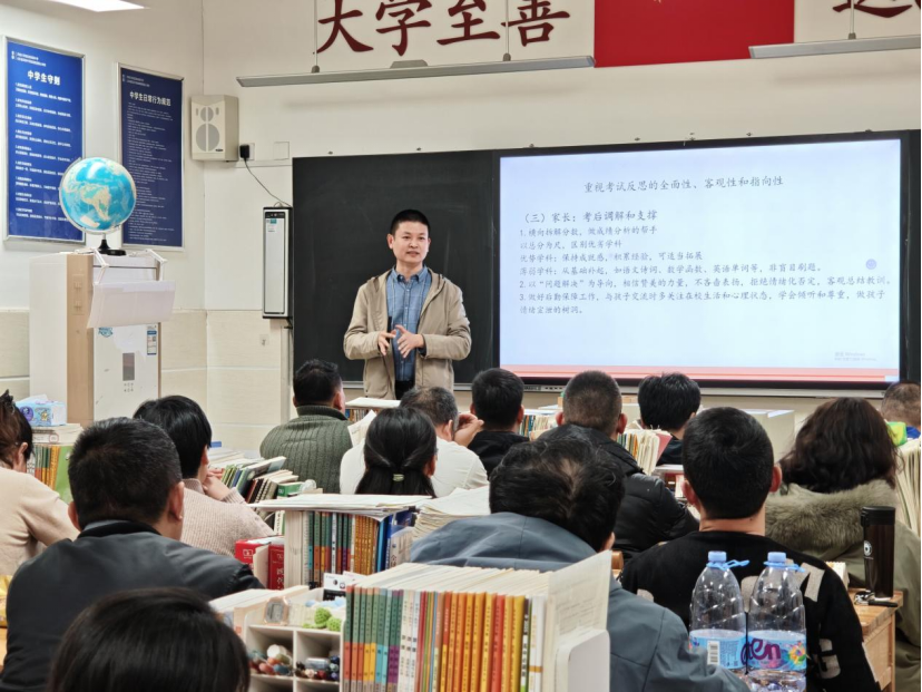 校级分享结束后,家长们回到孩子所在班级,参加由班主任主持的班级专题会议。班主任们以详实的数据为支撑,展开全面系统的成绩复盘:既呈现班级整体平均分、各学科优秀率及及格率等宏观数据,也聚焦学生个体的进退步情况,精准定位班级学习的优势领域与薄弱环节。结合课堂表现、作业完成质量等个性化案例,班主任们向家长直观反馈孩子的学业状态,让家长对孩子的在校情况有了清晰认知。