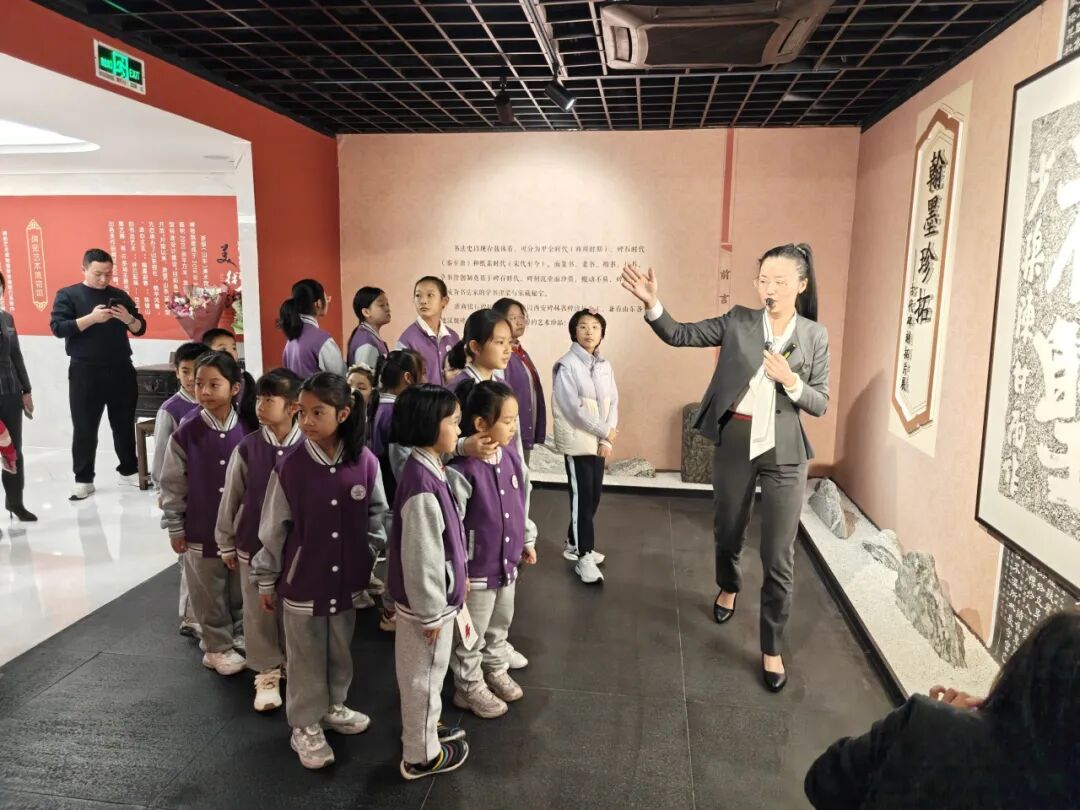 随后,孩子们来到浙商银行碑帖艺术博物馆。讲解员老师将汉字演化史化作一个个妙趣横生的小故事:从李斯规整典雅的小篆,到张旭笔走龙蛇的狂草;从历经岁月侵蚀的古代碑刻,到饱含家国情怀的近代伟人墨宝,她娓娓道来,带领孩子们循着笔墨的印记,见证汉字的千年流变。体验环节,讲解员老师拿出拓板、宣纸等碑拓制作工具,逐一展示讲解。当孩子们亲手触摸到古朴的工具,指尖触碰到宣纸与碑刻交融的质感时,也真切地感受到了文化传承的温度与力量。
