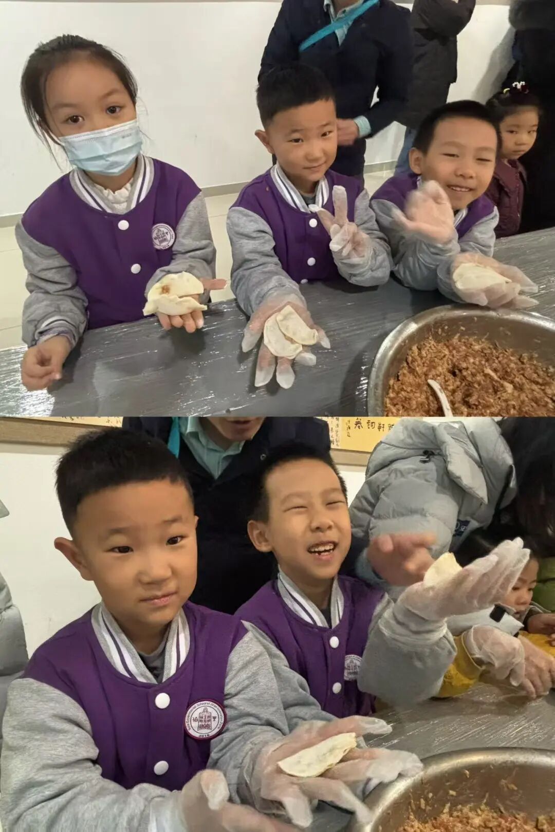 活动一开始,同学们就领到了可爱的集章卡,要去六个打卡点完成任务啦!冬至包饺子环节最热闹,小朋友们围在桌子旁,跟着爸爸妈妈一起用小手捏着饺子皮,舀一勺馅儿,小心翼翼地捏出弯弯的饺子边,虽然有的饺子长得“歪歪扭扭”,但都是大家亲手做的“冬至专属饺子”。