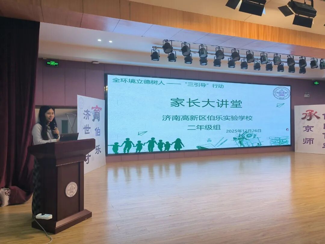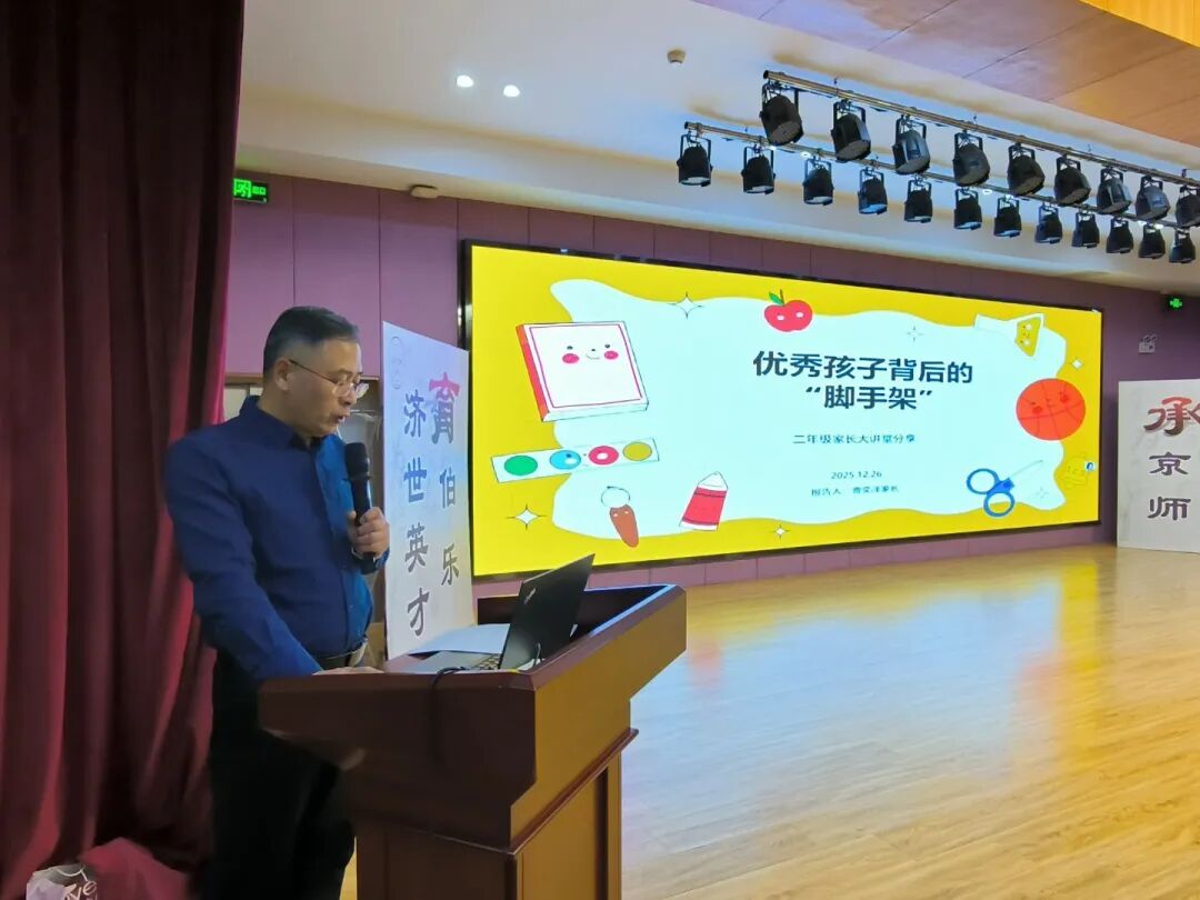 为了进一步深化全环境立德树人,落实“三引导”行动要求,搭建家校协同育人桥梁,2025年12月26日,济南高新区伯乐实验学校二年级家长大讲堂如期举行。活动由二年级二班班主任朱田田老师主持,特邀二年级学生曹奕泽爸爸担任主讲人,以“优秀孩子背后的‘脚手架’”为主题分享育儿心得,二年级三班班主任赵金梅老师作总结发言,为现场家长带来了一场干货满满的育儿盛宴。