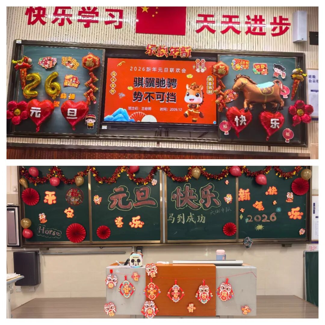 新年新景新气象,各班的“创意设计师”们早早就忙碌起来。五彩的气球、闪亮的彩带、寓意吉祥的“福”字窗花,还有同学们亲手绘制的元旦主题板报,将每间教室装点得喜庆又温馨。教室里的新年寄语和写满新年愿望的祝福树,不仅定格了过往的美好,更寄托着对未来的无限憧憬,让教室变成了一个充满烟火气的“新年派对现场”。