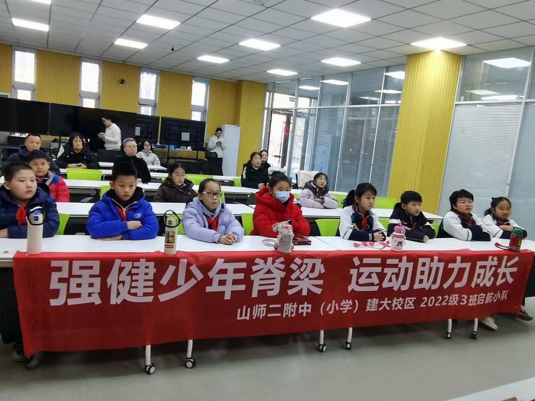 近日,山东师大二附中四(三)中队启航小队与山东体育学院携手,开展了一场别开生面的“强健少年脊梁,运动助力成长”主题健康促进活动。这场将专业筛查、科学讲座、实验室参观与特色运动相结合的活动,为孩子们带来了一堂生动的脊柱健康实践课。