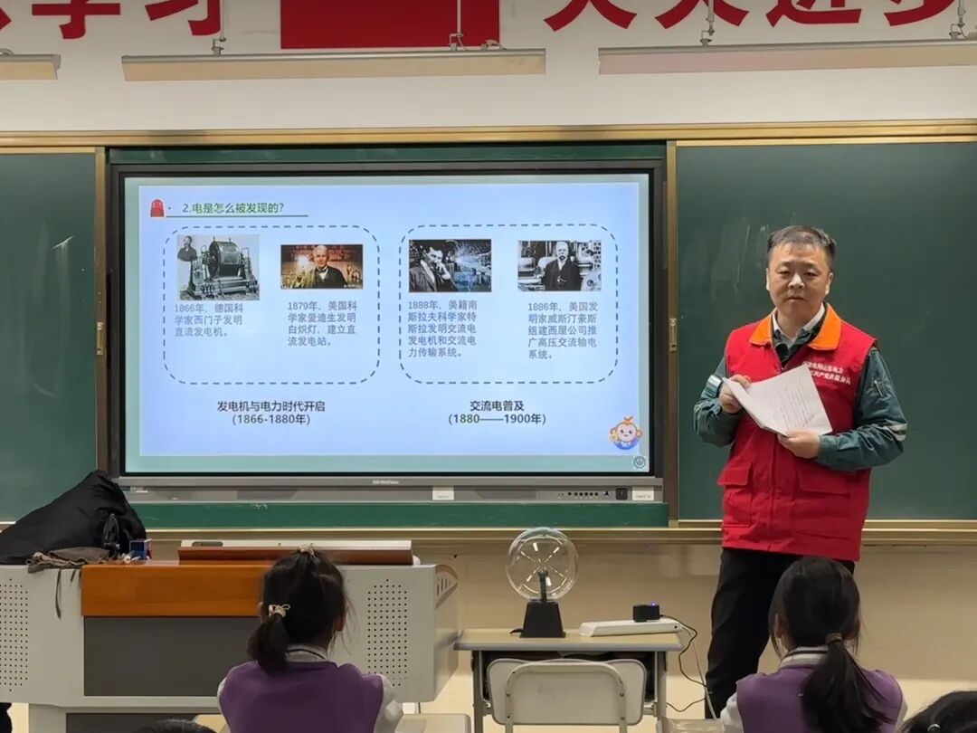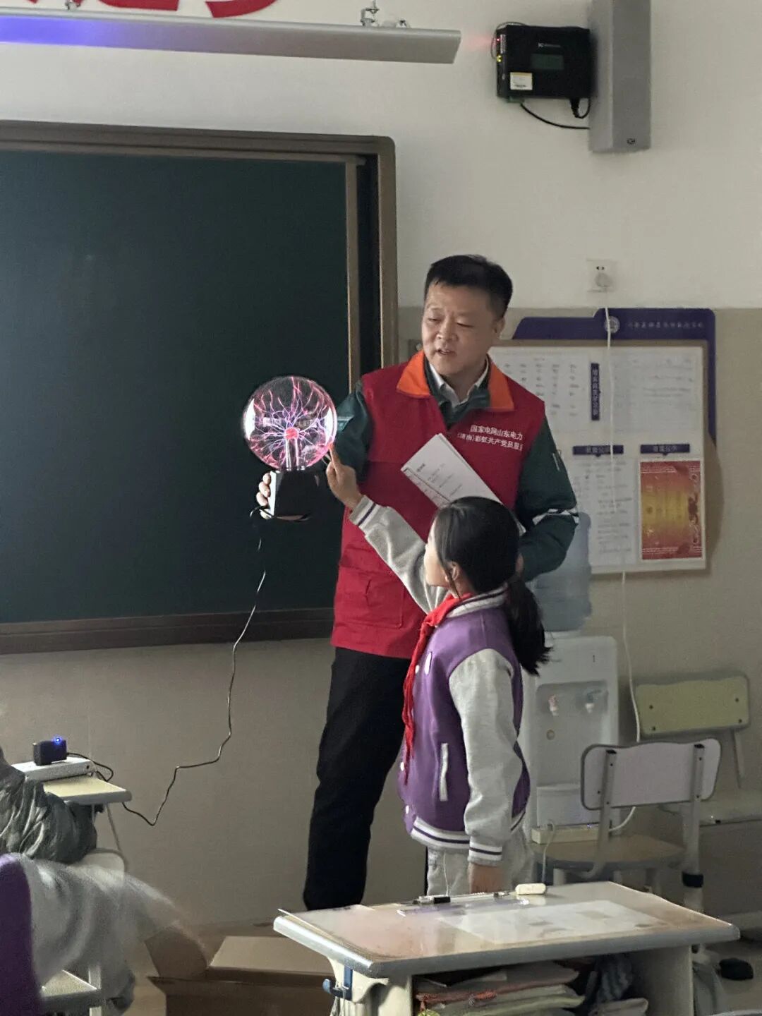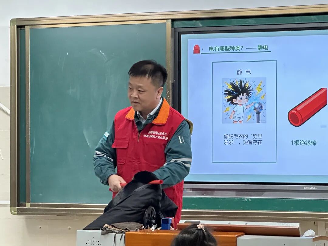 除了电的输送旅程,思宇爸爸还特意为孩子们科普了不同种类的电。他用通俗易懂的语言,区分了直流电和交流电的特点,同时,他还介绍了静电这种生活中常见的电,用“冬天脱毛衣会噼啪响”的例子,让孩子们一下子就明白了静电的存在,现场充满了欢快的讨论声。