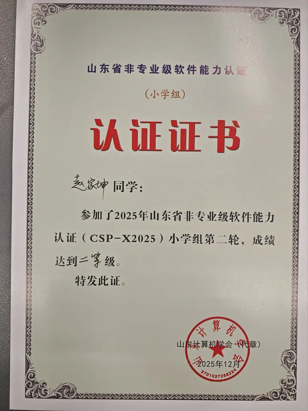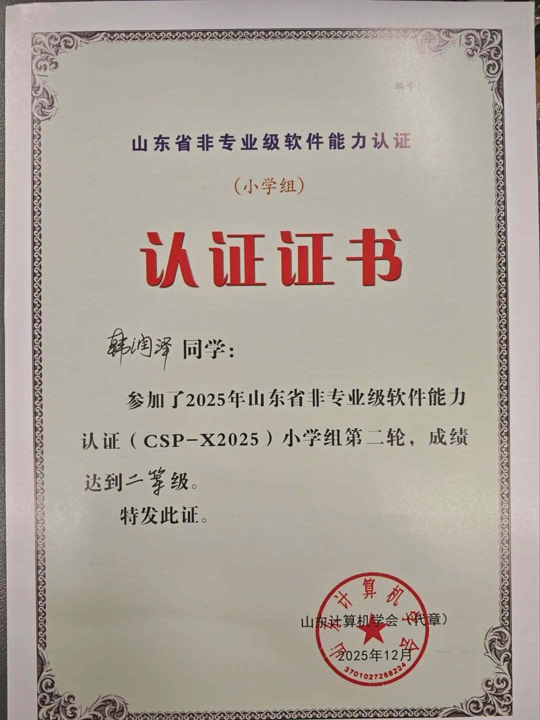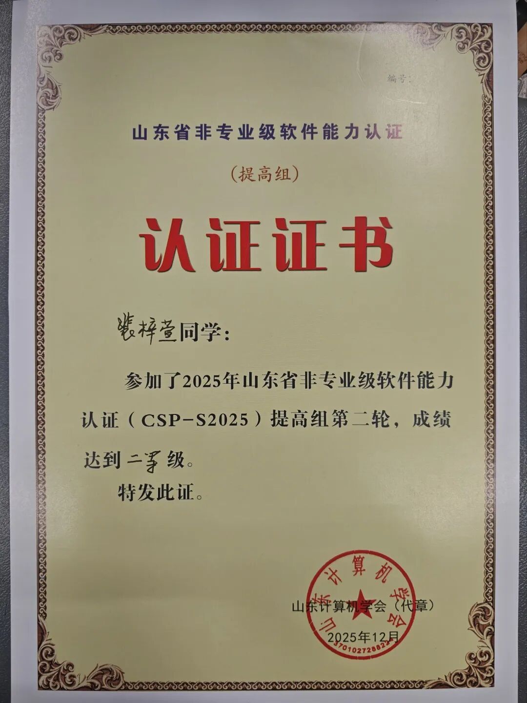 初中提高组:2024级裴梓萱同学荣获山东省二等奖。