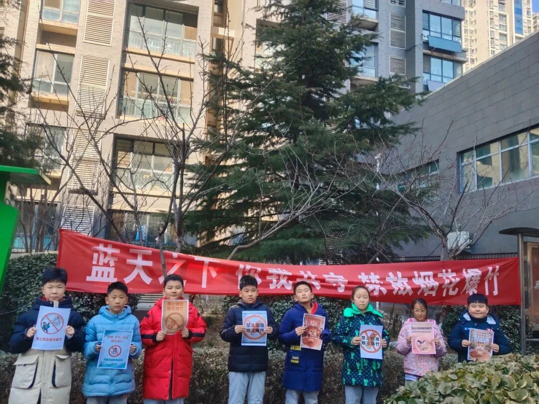 2月7日,伯乐实验学校四(1)中队阳光小组学生成长共同体的小伙伴们开展了 “禁放烟花爆竹” 宣传活动。他们手持宣传海报,在小区广场拉起了 “蓝天之下 你我共守 禁放烟花爆竹” 的横幅,用稚嫩的声音向居民们讲解燃放烟花爆竹对空气和环境的危害。
