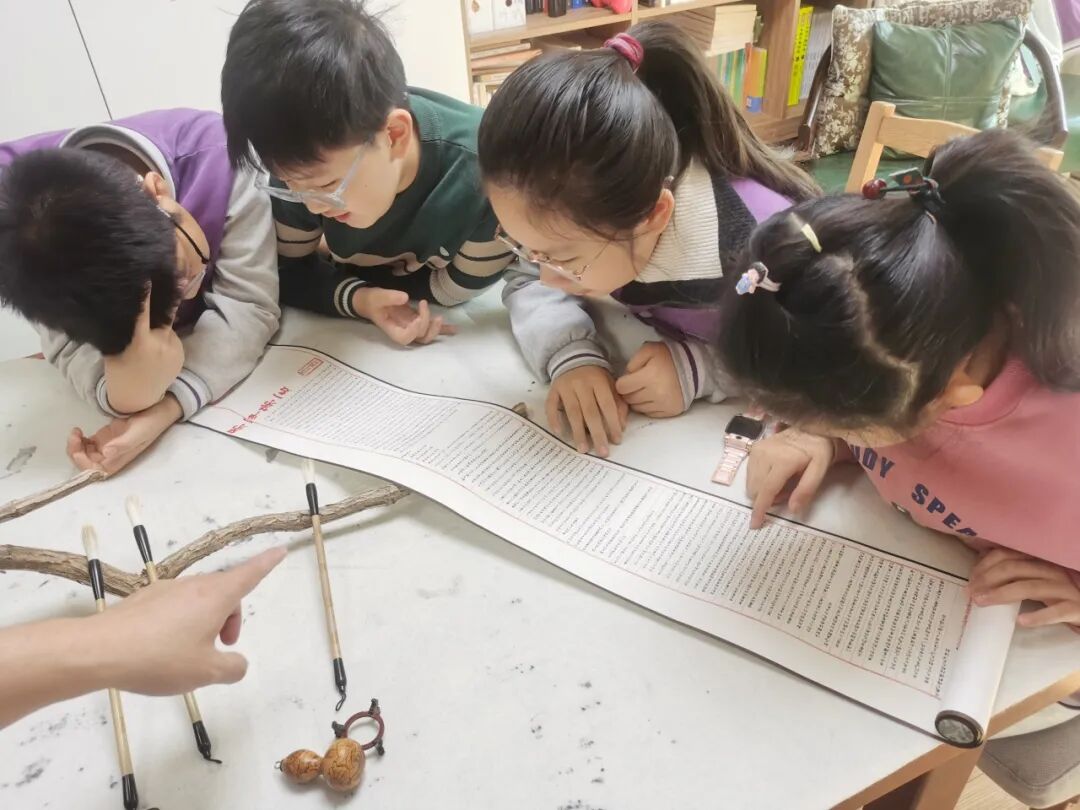 “笔墨纸砚,文房四宝,缺一不可。”在家长志愿者的指导下,孩子们围坐在画案前,第一次近距离接触这些书画创作的“好伙伴”。家长志愿者耐心讲解着毛笔的“尖、齐、圆、健”四德,演示着如何“研墨如病”,以及宣纸“吸水晕染”的特性。孩子们小心翼翼地触摸着狼毫的柔软、端砚的温润,在实践中体会着古人“工欲善其事,必先利其器”的智慧。