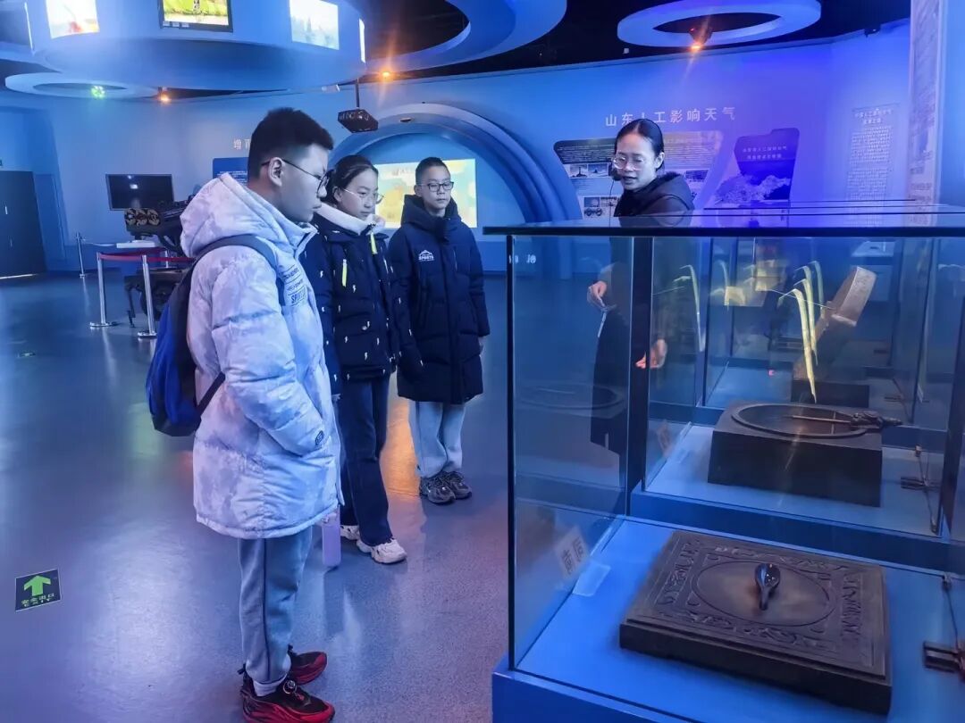 在讲解员的带领下,队员们首先驻足气象历史展区。雨量筒、风向标、日晷、司南等一系列古老的发明在告诉世人,我们人类对天气的探索从未停止。同学们还通过风力模拟装置,亲身感受了一级到七级不同等级的风力带来的不同体验。
