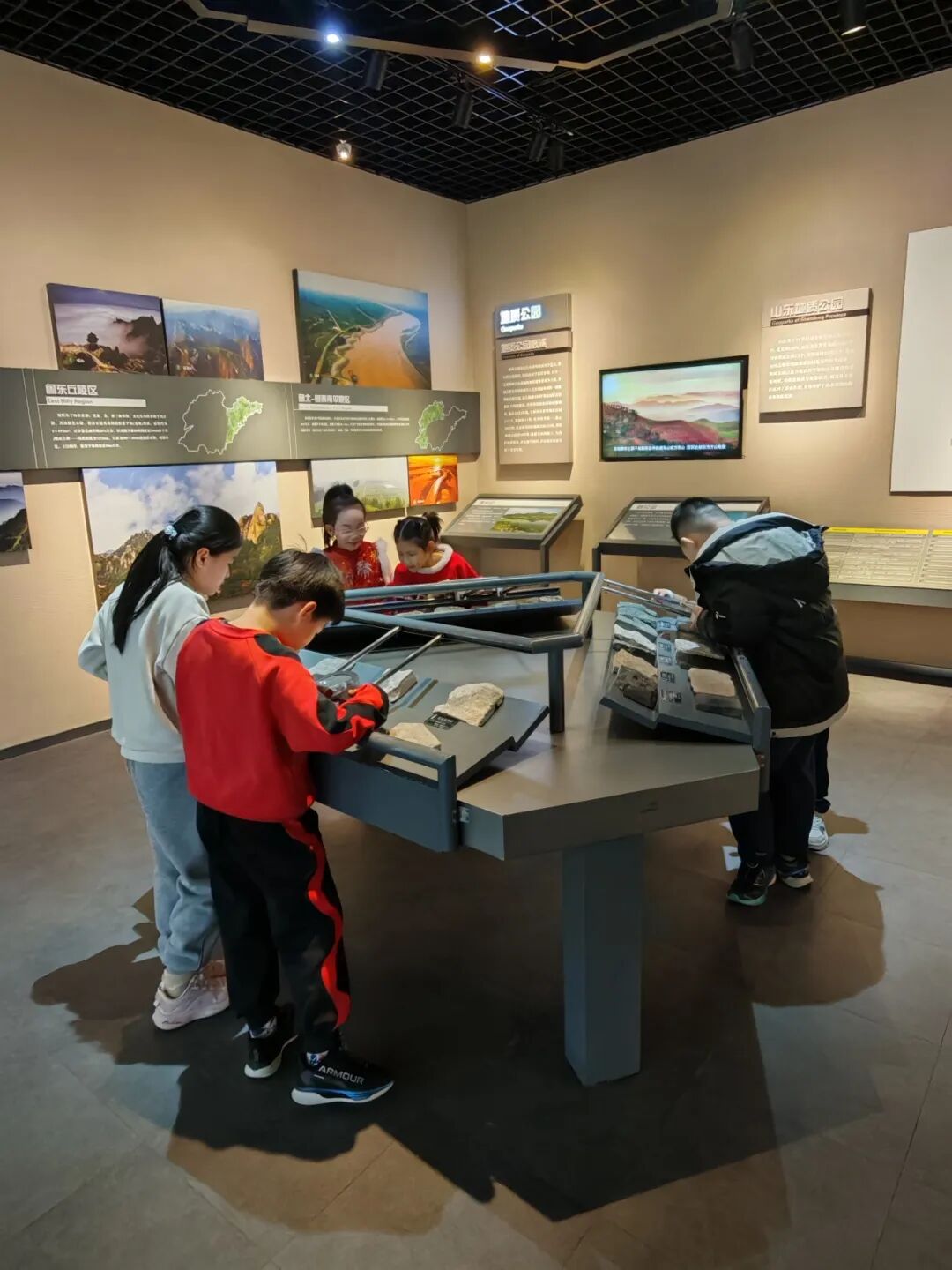 博物馆的互动体验区,更是让这场研学之旅充满趣味与欢乐。4D 动感影院里,逼真的画面与震撼的音效,将白垩纪的恐龙世界生动再现,让同学们仿佛身临其境,近距离感受恐龙的生活场景;山东矿产资源分布光电模型、石油勘查开采模型等互动设施,将抽象的地质知识转化为直观的视觉体验,同学们围在模型旁积极提问、相互交流,在动手观察、趣味探讨中,轻松掌握了课本之外的地质小知识。