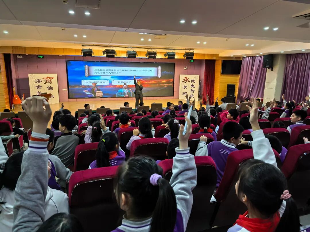 午后阳光透过窗户洒在孩子们稚嫩的脸庞上,四年级的同学们怀揣着好奇与期待,整齐有序地步入伯乐礼堂。 “你们知道吗?在两千多年前,有一位少年,在13岁的时候就成为了王,并最终终结了五百年的乱世……” 随着老师富有磁性的声音响起,大屏幕上缓缓展开战国七雄的版图。孩子们瞬间被带回了那个金戈铁马、英雄辈出的时代。
