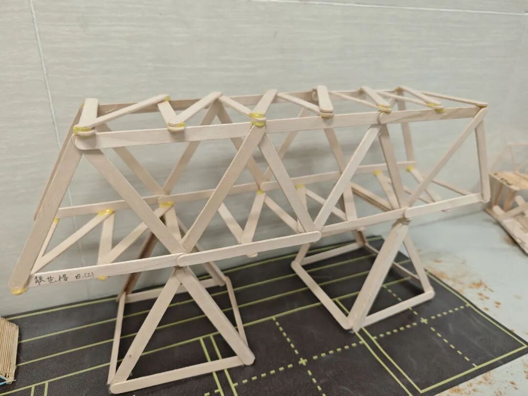 课堂上的几何知识不再是书本上的线条与定义,而是变成了同学们手中的创作灵感。大家巧用牙签、木棒、雪糕棍等常见材料,大胆构思、分工协作,亲手搭建出一座座精巧的模型:稳固的小桥、实用的衣架、充满童趣的摩天轮,还有别致的小房子与高耸的塔架……