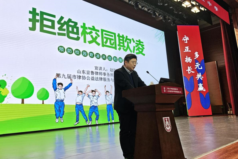 春满校园,法润心田。为切实守护学生身心健康,构建安全、和谐、文明的校园环境,3月31日,济南大学城实验高中特邀法治副校长、山东京鲁律师事务所创始合伙人、第九届市律协公益法律服务与社会责任工作委员会成员赵阳律师,开展以“拒绝校园欺凌”为主题的法治宣讲活动,为师生送上一堂兼具温度与深度的反欺凌“必修课”。