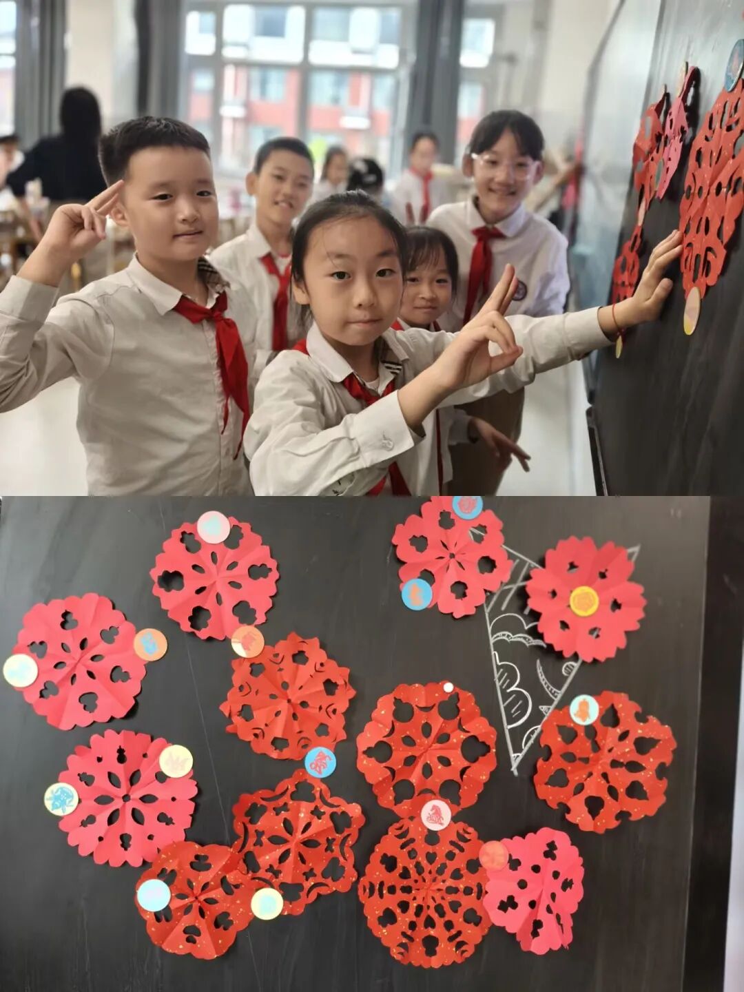 活动最后,孩子们的作品被精心展示在黑板上,错落有致的红色剪纸,既是同学们动手能力的展现,更是非遗文化在孩子们心中生根发芽的见证。