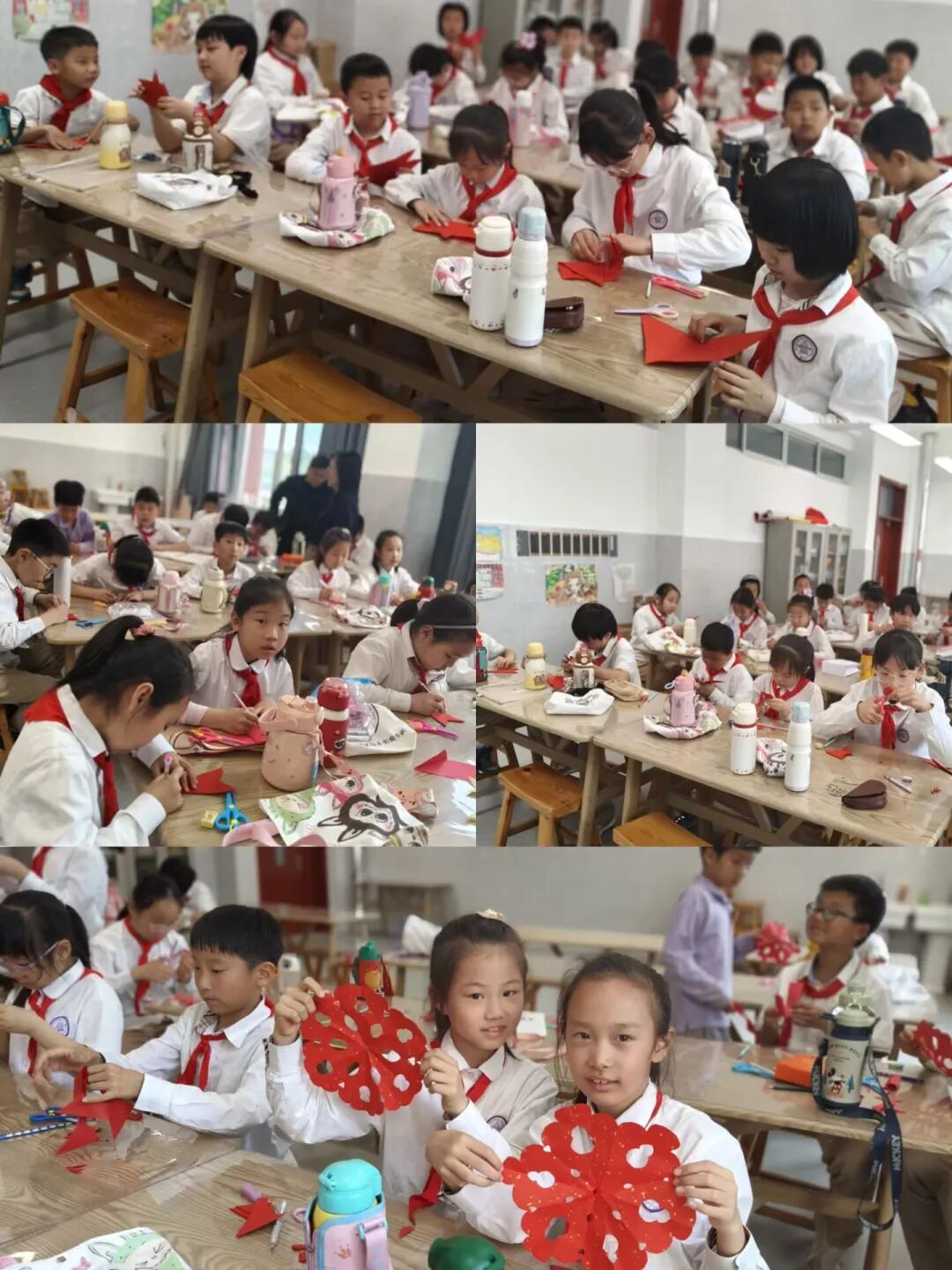 在剪纸课堂上,乜老师用生动有趣的讲解,带领同学们重温了剪纸的基础步骤,演示了“五折法”剪五角星的技巧,赢得了孩子们的阵阵掌声。随后,老师带领大家跟着“折—画—剪—展”的流程,学习“三折法”创作圆形团花。同学们认真操作、大胆创作,一把把小剪刀在红纸上翻飞,将普通的红纸变成了一朵朵灵动的红色团花。