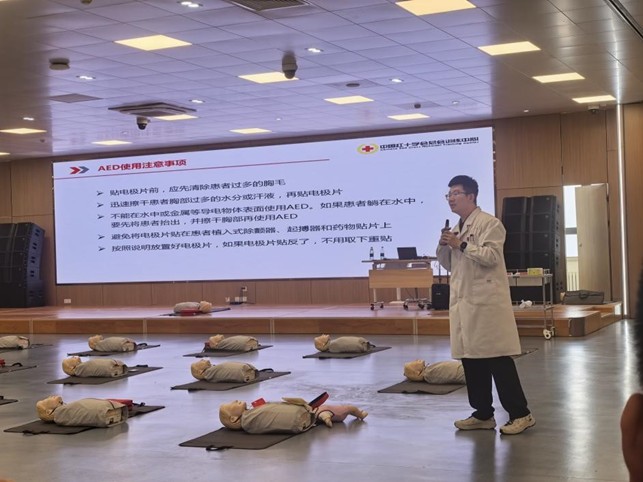 AED(自动体外除颤器)的使用将培训推向高潮。结合操作注意事项,完整演示开机、粘贴电极片、心律分析、实施除颤的全流程,强调规范操作的重要性,帮助班主任厘清急救关键环节。