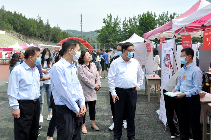 中国教育在线讯 为满足山东卫生健康事业发展对医药卫生类技术技能型人才的需要,进一步推进产教融合及校企合作,助力医养健康产业新旧动能转换,5月19日,由济南市人力资源和社会保障局主办、山东医学高等专科学校、济南市公共就业服务中心、济南市市中区人力资源和社会保障局共同承办的“2021年济南市春季高校毕业生就业市场(医学类)暨山东医学高等专科学校(济南)毕业生供需见面洽谈会”在山东医专济南校区隆重举行。济南市公共就业服务中心副主任杨勇刚、济南市市中区公共就业和人才服务中心主任张焕利莅临洽谈会现场指导工作。学校校长舒德峰、副校长葛淑兰到洽谈会现场调研。