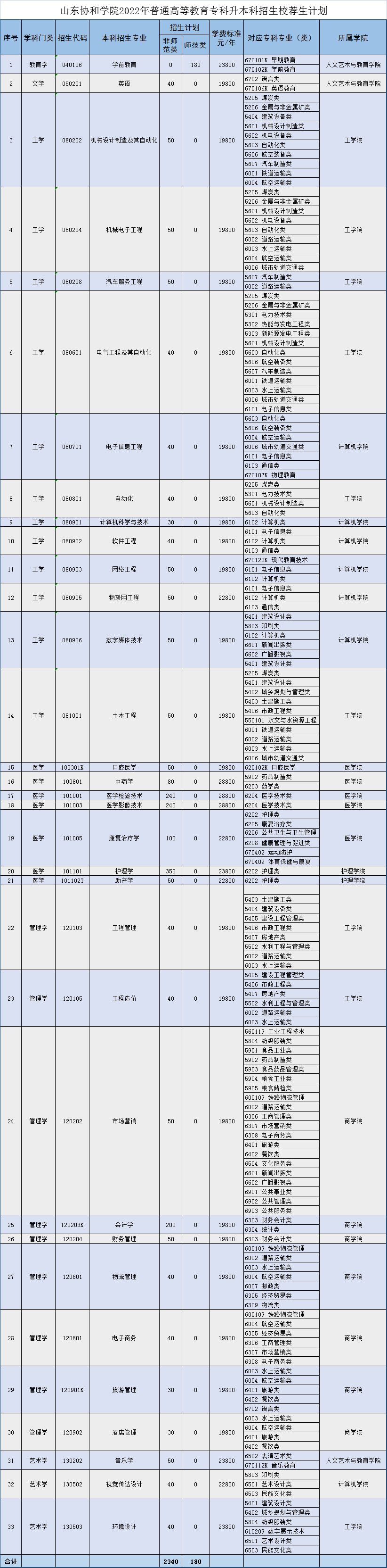 山东协和学院2022年普通高等教育专科升本科招生校荐生专业和计划
