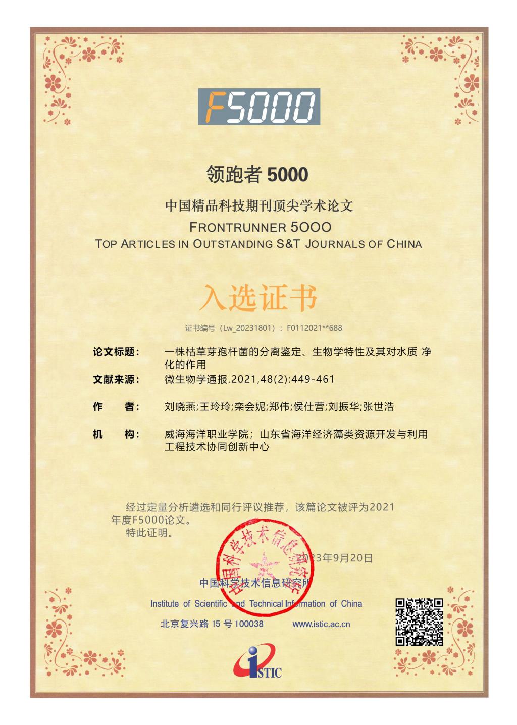 威海海洋职业学院海洋生物系团队发表在《微生物学通报》2021年第48卷02期上的学术论文《一株枯草芽孢杆菌的分离鉴定、生物学特性及其对水质净化的作用》成功入选“领跑者5000——中国精品科技期刊顶尖学术论文(F5000)”名单。