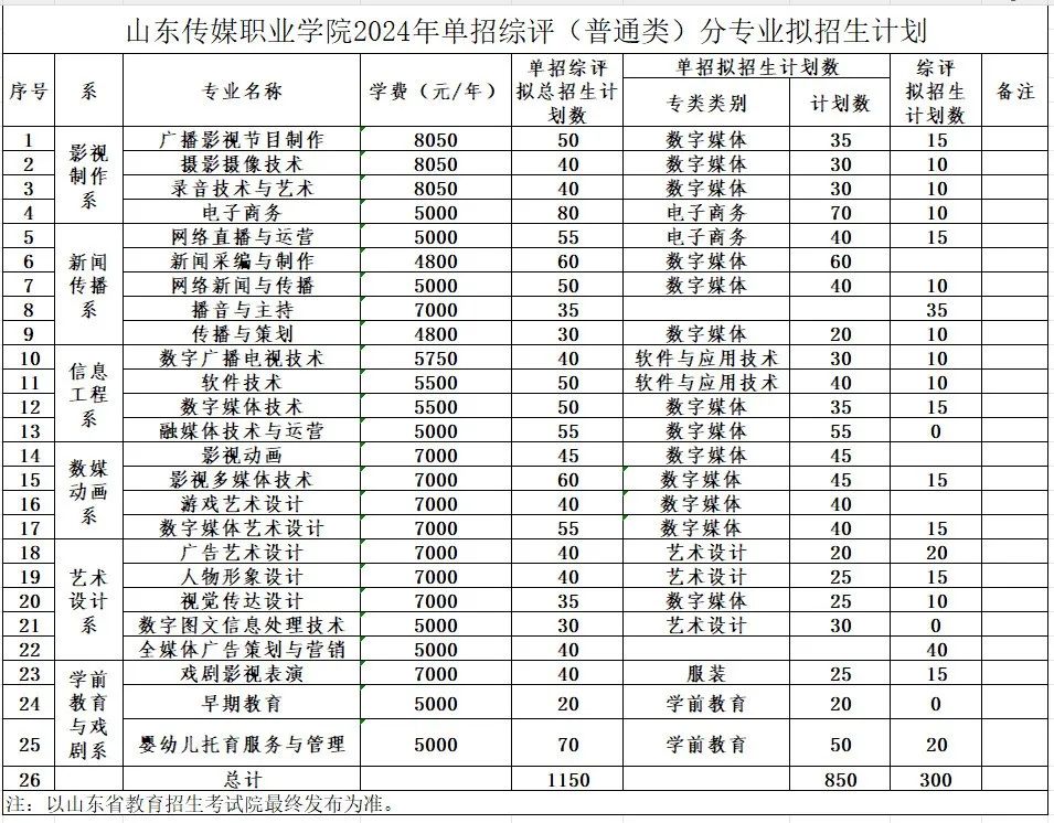 山东传媒职业学院2024年单招综评分专业拟招生计划