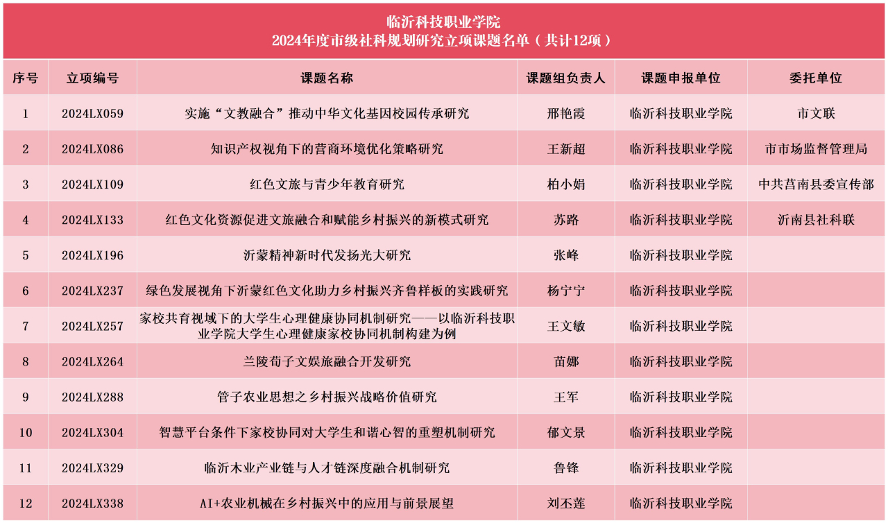 近日,市社科联公布了2024年度市级社科规划研究立项课题名单,临沂科技职业学院12个项目获批立项。