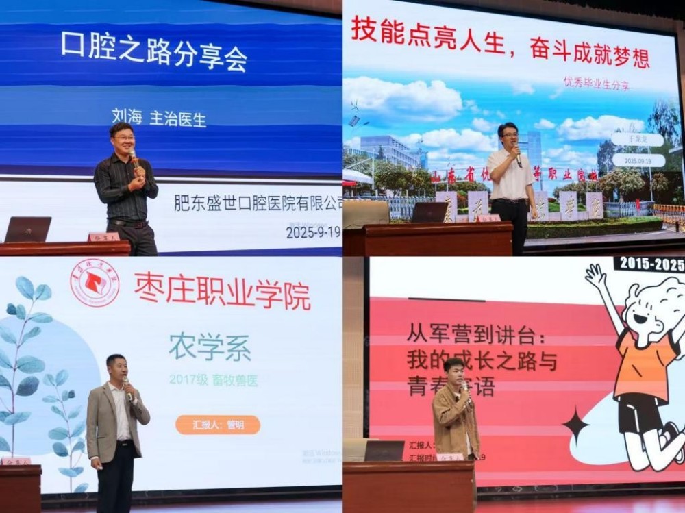 分享会邀请了安徽肥东盛世口腔医院有限公司董事长刘海、山东化工职业学院教师于龙龙、山东健袖生态科技有限公司养殖场场长管明、枣庄科技职业学院教师姜建州,四位在不同领域取得突出成绩的优秀毕业生。四位校友结合自身的学习和工作经历,从职业规划、专业学习、就业创业等方面与在场学生进行了深入交流和分享。