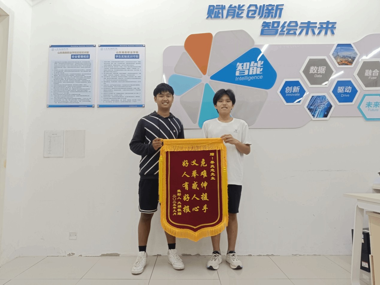 9月16日,一面写有“危难伸援手 义举感人心 好人有好报”的锦旗送至山东商务职业学院,揭开了两位学生在今年暑假见义勇为、冷静施救的感人故事。学校信息工程学院2024级人工智能1班学生秦兆志、张弘烨,在街头面对突发危急情况沉着应对、高效协作,成功救助一名因高烧休克昏迷的儿童,以实际行动诠释了“商务学子”核心品质。