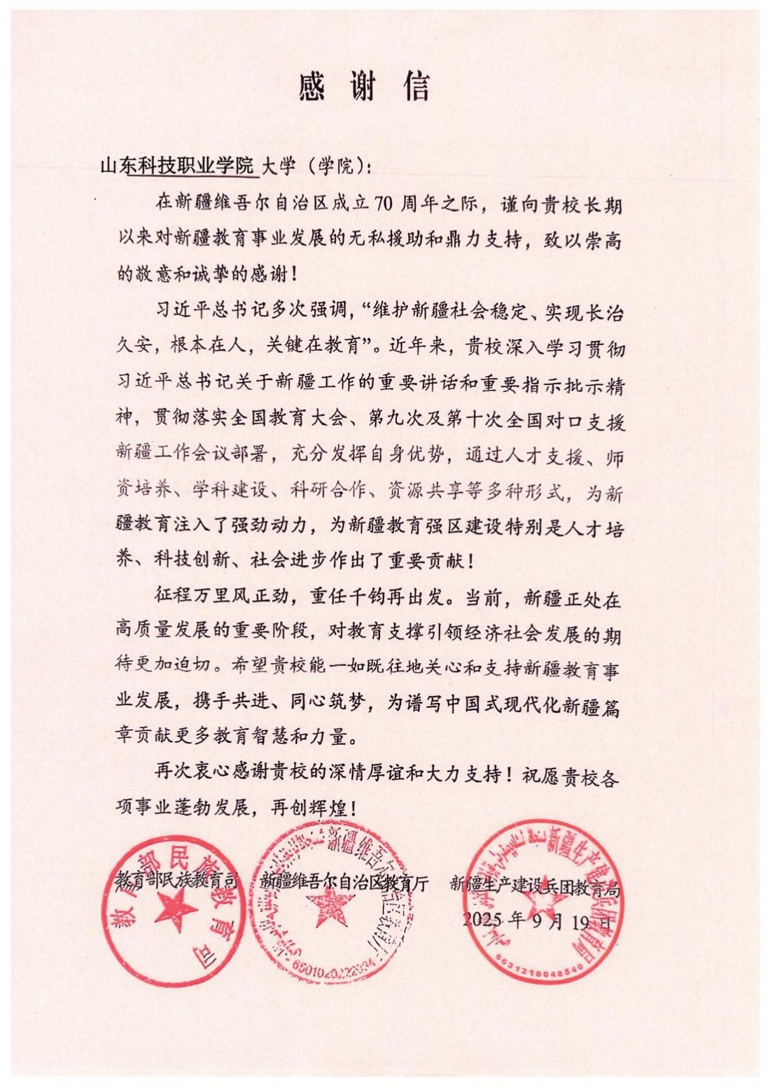 近日,山东科技职业学院收到由教育部民族教育司、新疆维吾尔自治区教育厅、新疆生产建设兵团教育局联合发来的感谢信。这封跨越近4000公里的信件,既饱含着对学校援疆教师的深深谢意,更体现了对学校长期以来支援新疆职业教育发展的高度认可。