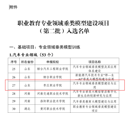 枣庄职业学院汽车专业垂类模型建设项目成功入选教育部第二批建设名单