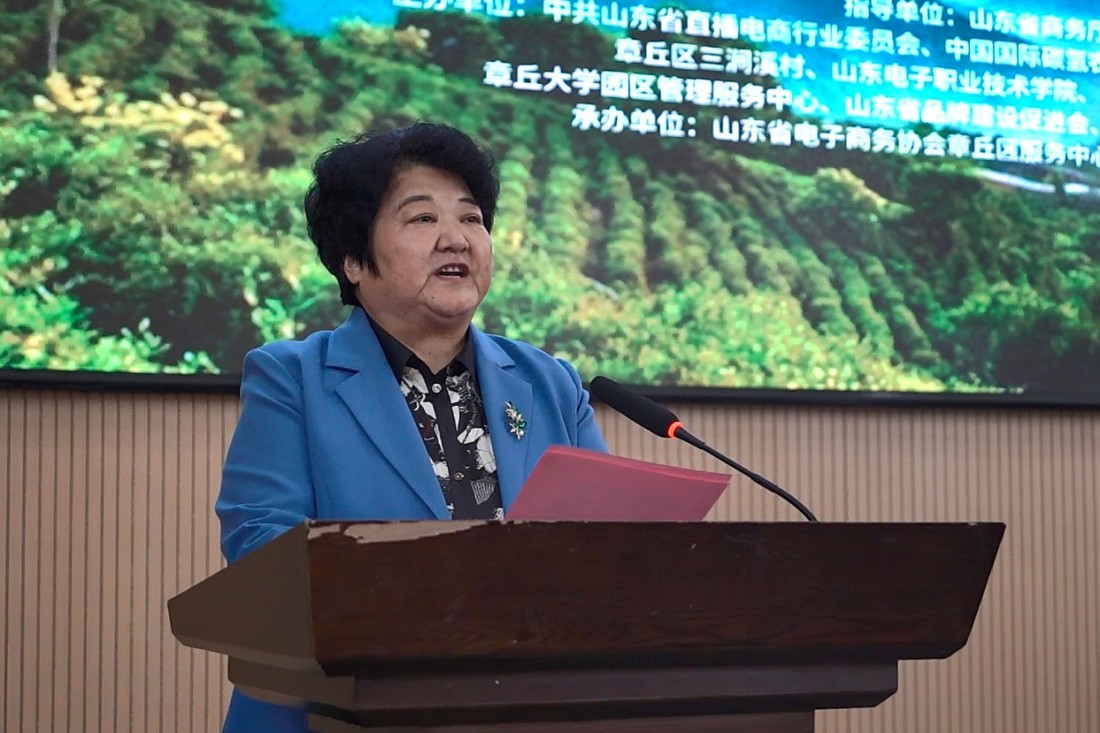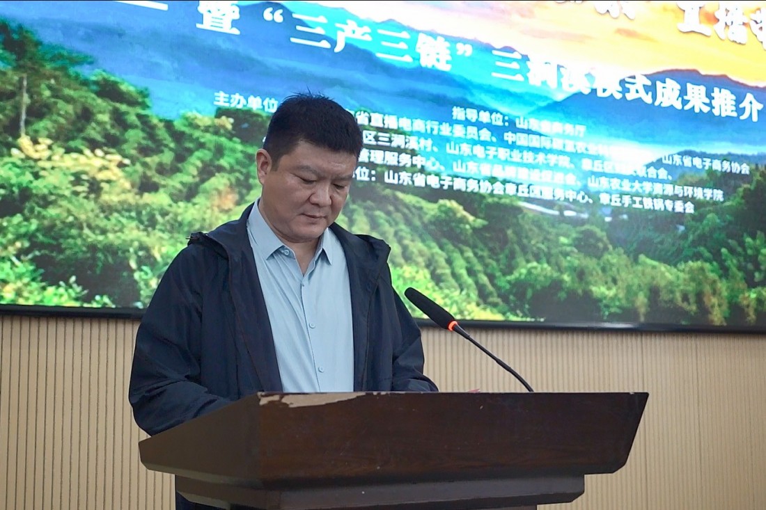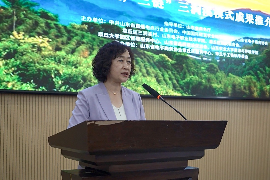 “模式推介与成果发布”环节,山东省电子商务协会会长田青、秘书长于登杰先后发言,并解读了“三产三链”模式。山东电子职业技术学院商务管理系党总支书记、系主任李敏作了《服务乡村振兴的高职电商“双创新质”人才培养模式创新与实践》主旨报告,介绍了学校以党建为牵引,多年来为三涧溪村数字化建设开展技术赋能工作,推进“人人播工程”培训、章丘云仓与供应链产教融合实践基地建设,通过构建“双创新质”人才培养体系,将产业真实项目融入教学,引导学生参与三涧溪村“三产三链”乡村振兴实践的路径,取得“课堂建在三涧溪”教学模式改革阶段性成果。
