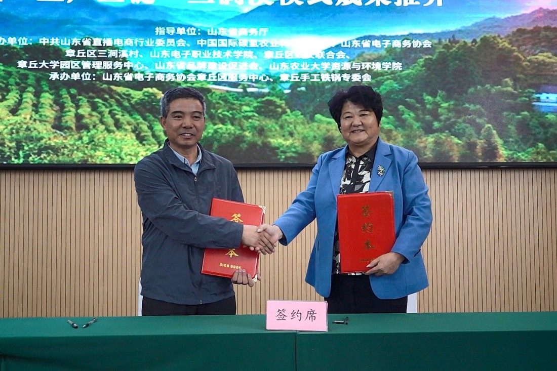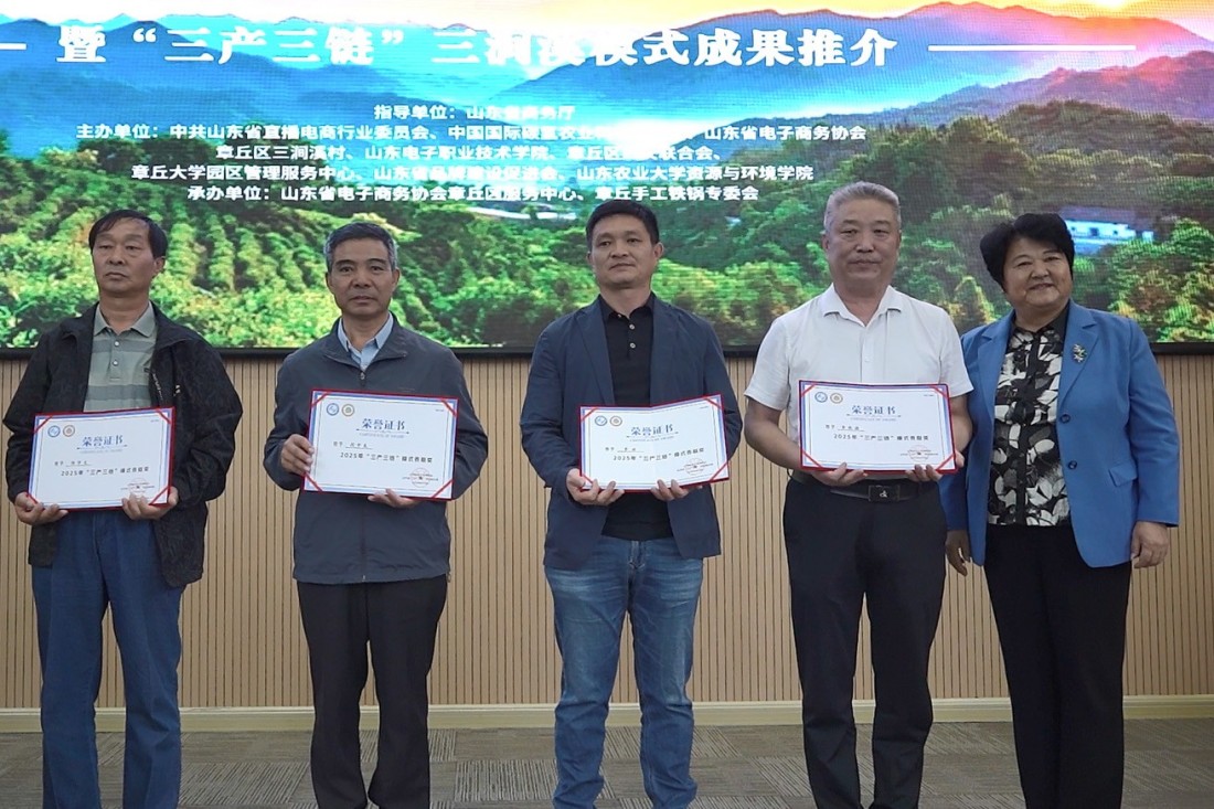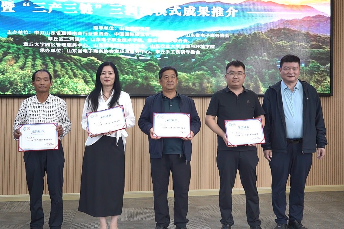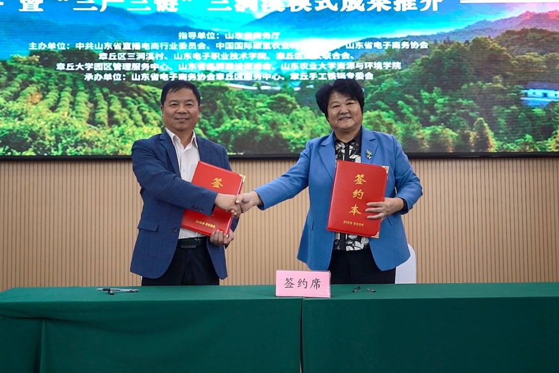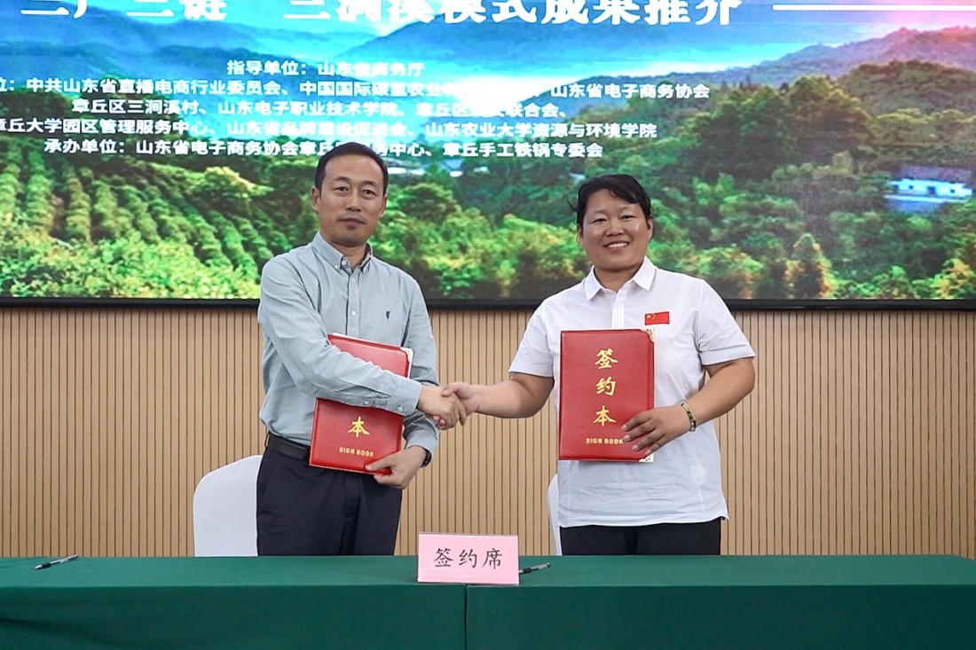 随后,活动现场发布了山东省云仓服务体系、电子商务大数据平台、章丘手工铁锅团队标准三项成果。三涧溪村分别与临沂市兰陵县神山镇青竹山西村、商河县玉皇庙镇段家村签署“三产三链”帮扶合作项目,标志着“三涧溪模式”正式迈向区域协同与复制推广。签约后,现场为“外贸优品·好品山东—推荐官”颁发证书。