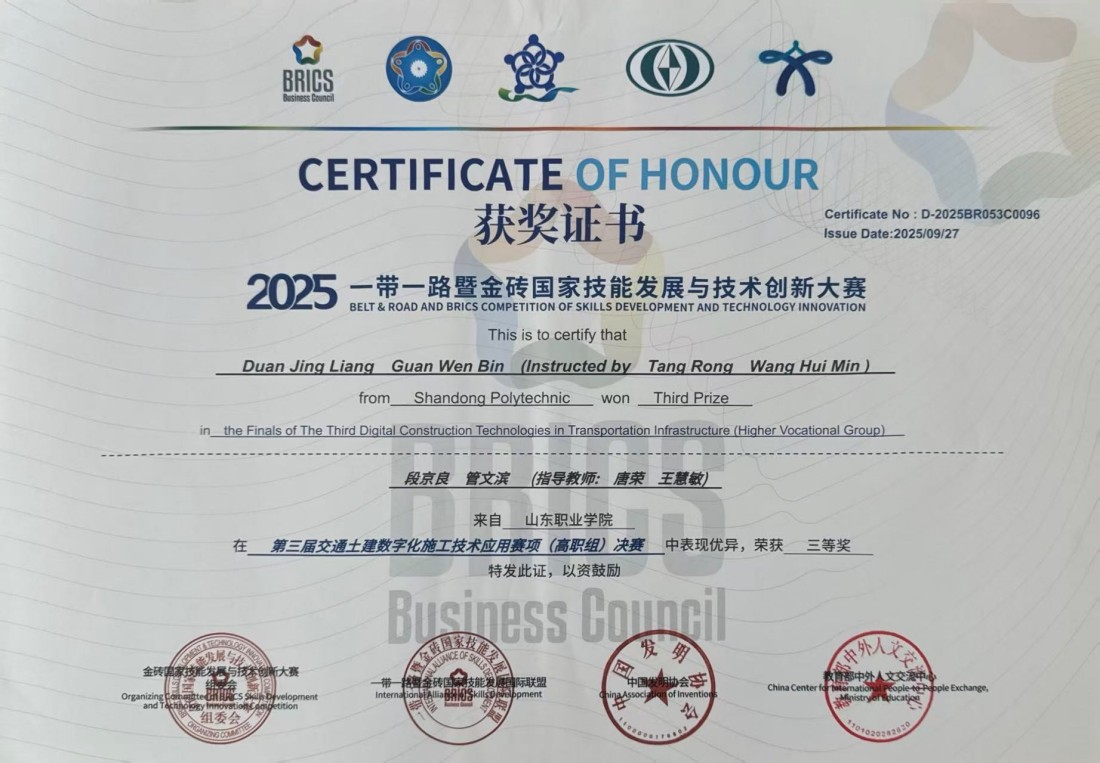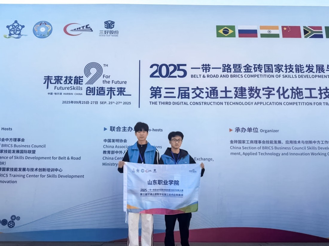 9月27日,2025“一带一路”暨金砖国家技能发展与技术创新大赛第三届交通土建数字化施工技术应用竞赛全国总决赛在哈尔滨铁道职业技术学院圆满闭幕。山东职业学院教师唐荣、王慧敏指导的段京良、管文滨荣获高职组全国总决赛三等奖。