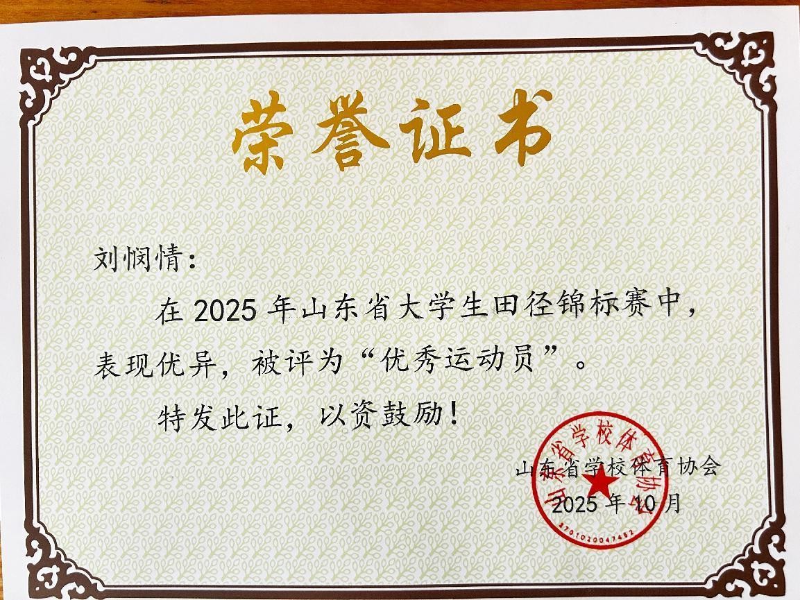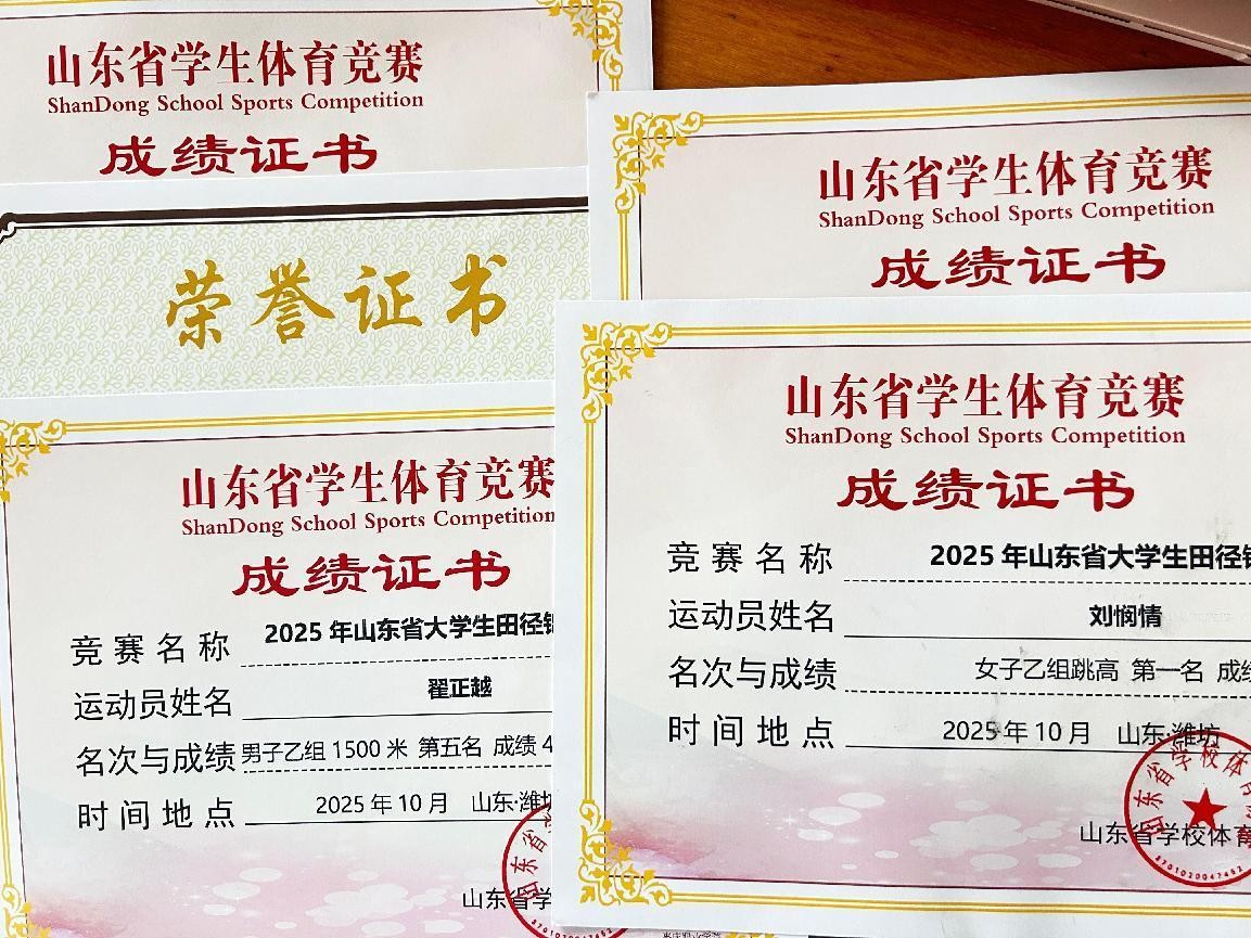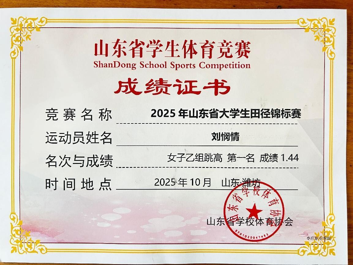 山东省大学生田径锦标赛由山东省学校体育协会主办,每年举办一届,是省内高校体育教学水平与日常训练成果的重要展示平台和集中检阅窗口。本届赛事规模盛大,共有68所高校的1000余名运动员同台竞技、一较高下。学院高度重视此次赛事,精心选派运动员参赛。经过五天的激烈角逐,学子们凭借顽强拼搏的体育精神和扎实稳定的竞技水平,在多个项目中脱颖而出。2024级高职酒店管理2班刘悯情同学摘得女子乙组跳高桂冠并荣获“优秀运动员”称号;2024级高职(中外合作)汽车制造与试验技术2班翟正越同学表现亮眼,分获男子乙组1500米第五名、800米第六名,为学院赢得了荣誉。