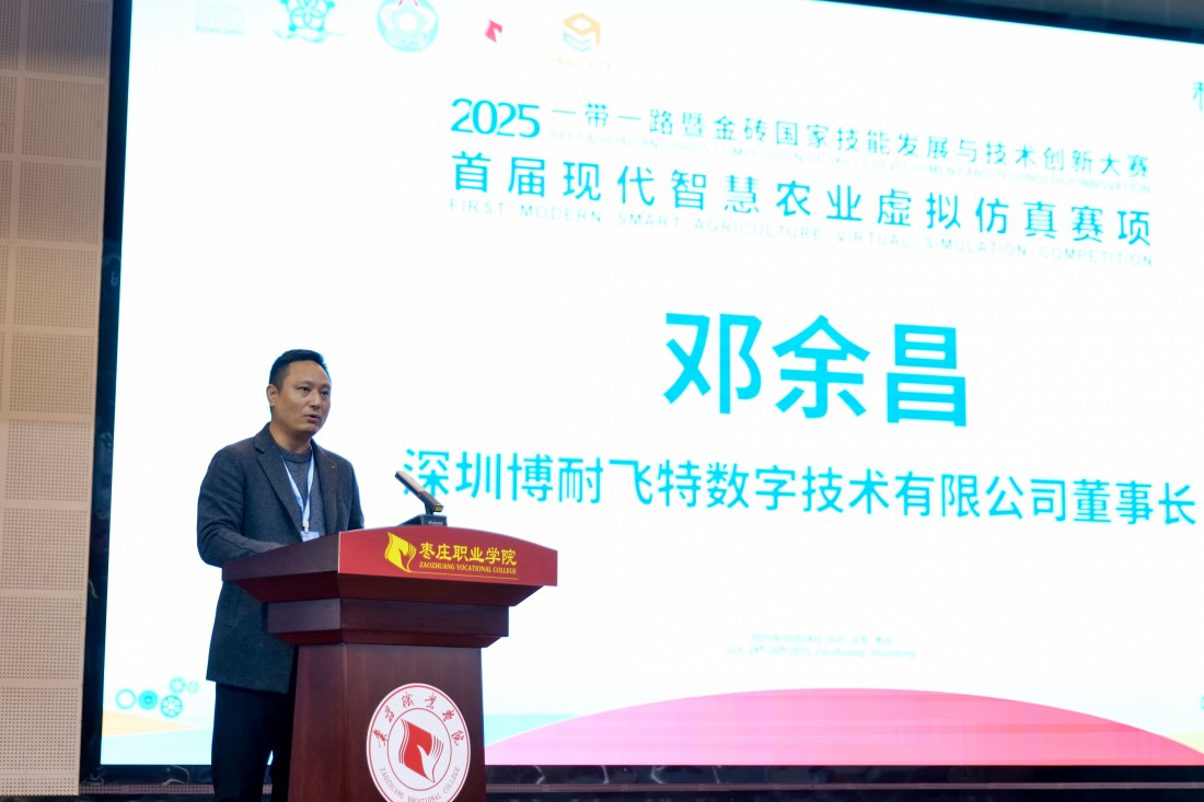 10月24日,2025年“一带一路”暨金砖国家技能发展与技术创新大赛首届现代智慧农业虚拟仿真赛项在山东枣庄职业学院盛大开幕。枣庄职业学院党委副书记、院长梁家和,枣庄市委教育工委常务副书记,市教育局党组书记、局长王光明,市农业农村事业发展中心副主任陆怡林,金砖国家技能发展与技术创新大赛组委会执委会国内竞赛办公室副主任崔雪艳,赛项专家组组长刘义国,大赛裁判长巩彪,大赛监督仲裁长常介田,深圳博耐飞特数字技术有限公司董事长邓余昌,枣庄职业学院领导班子成员和来自国内100多所院校的400名选手出席开幕式。开幕式由枣庄职业学院党委委员、副院长刘希震主持。