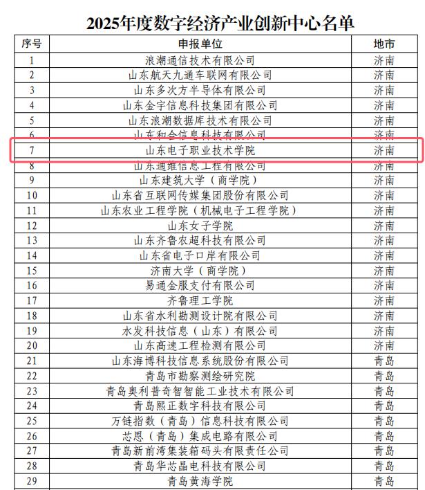近日,山东省工业和信息化厅公布2025年度山东省数字经济创新平台名单,由山东电子职业技术学院牵头申报的“数字经济产业创新中心”成功入选,体现了学校在服务数字经济发展、推动产业创新方面取得重要进展。