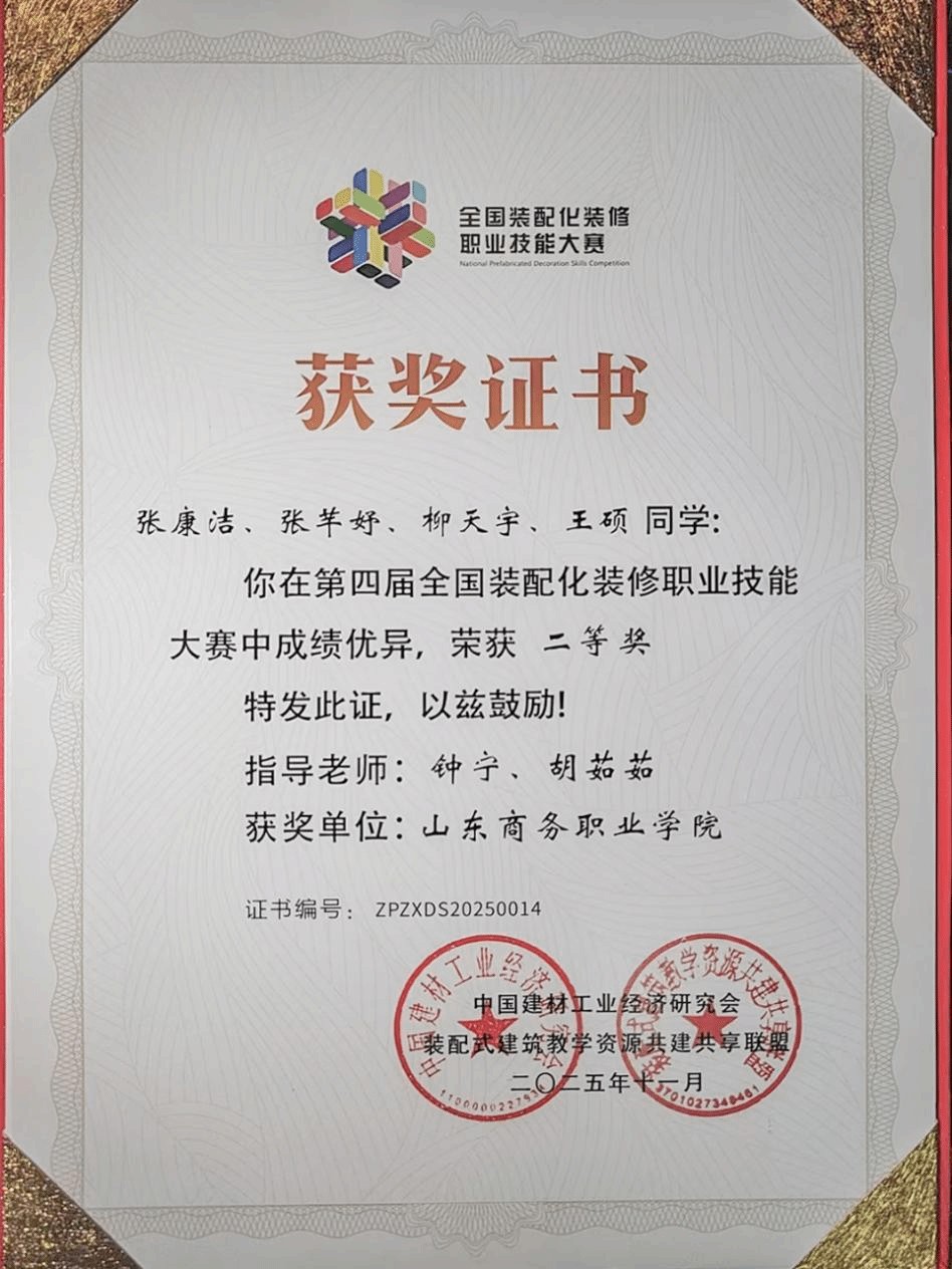 第四届全国装配化装修职业技能竞赛全国总决赛在浙江工业职业技术学院(浙江绍兴)落幕。山东商务职业学院建筑工程学院钟宁、胡茹茹老师指导的建筑装饰工程技术专业参赛队,从全国百余支优秀队伍中突围,最终荣获全国二等奖。此次获奖不仅是对参赛师生专业能力的高度认可,更充分彰显我校在建筑装饰前沿领域的人才培养硬实力,为学校职业技能竞赛成果再添重要一笔。