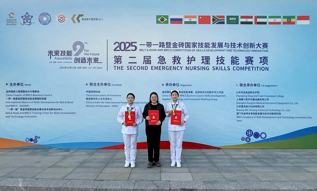 近日,2025一带一路暨金砖国家技能发展与技术创新大赛第二届急救护理技能赛项在山东药品食品职业学院圆满落幕。枣庄职业学院医学院教师满中雯指导的张萍、于雪两位同学表现优异,凭借扎实的专业技能与出色的团队协作能力,最终荣获二等奖。