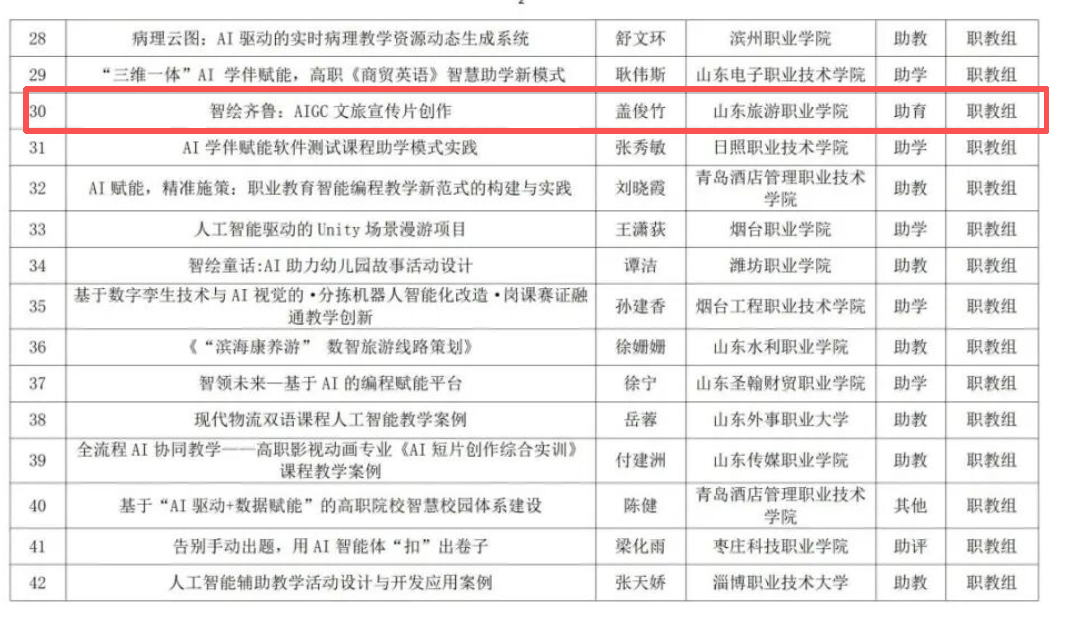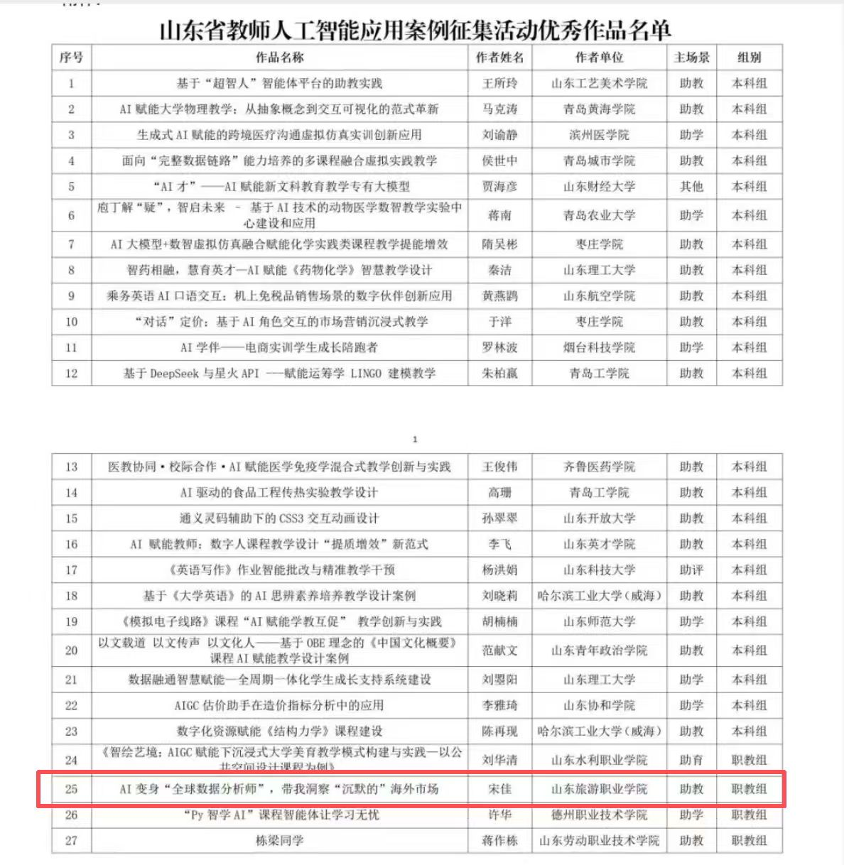 近日,山东省电化教育馆发布《教师人工智能应用案例征集活动优秀作品公示》,根据《山东省电化教育馆关于征集教师人工智能应用案例的通知》(鲁教馆函〔2025〕43号)要求,经材料审核、省级评审等多环节严格遴选,山东旅游职业学院盖俊竹老师的《智绘齐鲁:AIGC文旅宣传片制作》和宋佳教师的《AI变身“全球数据分析师”,带我洞察“沉默的”海外市场》两个人工智能应用案例成功入选优秀作品名单,充分彰显了学院在人工智能赋能教育教学领域的扎实实践与显著成效。