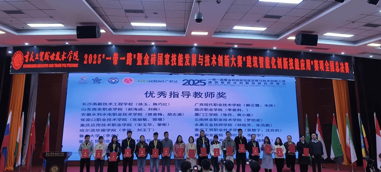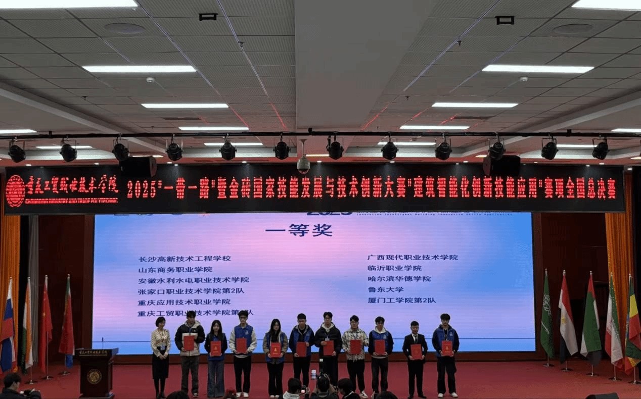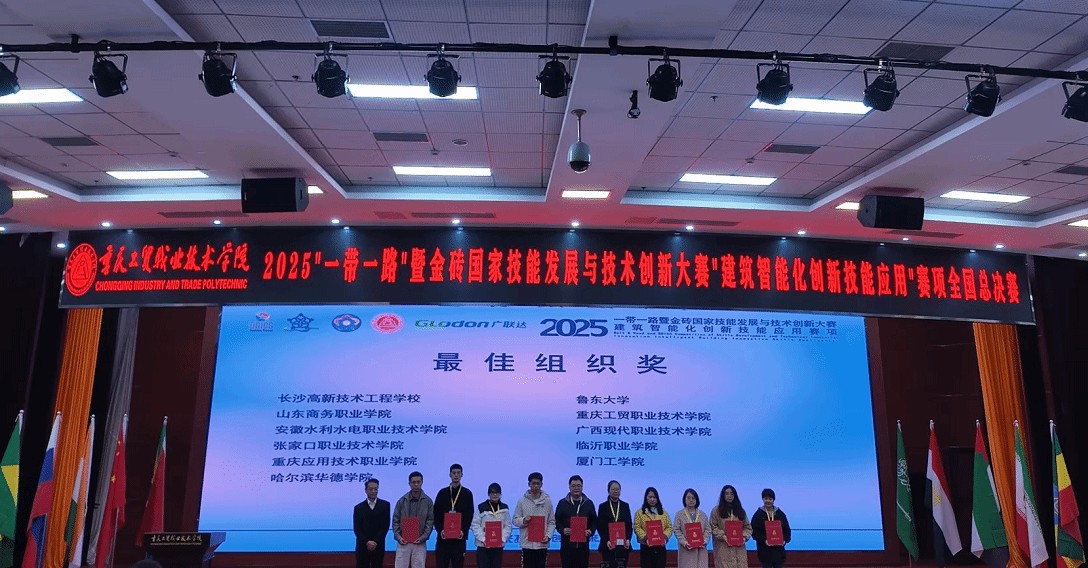 11月23日,2025年一带一路暨金砖国家技能发展与技术创新大赛“建筑智能化创新技能应用”赛项全国总决赛在重庆涪陵圆满落幕。山东商务职业学院建筑工程学院派出由管吉睿、李雨萱、孔文玉三位同学组成的参赛团队参加该赛项建筑物联网方向决赛,凭借扎实的专业功底、出色的技术创新能力与默契的团队协作,以第一名的优异成绩,勇夺该赛项全国总决赛高职组一等奖;同时学校获“最佳组织奖”。