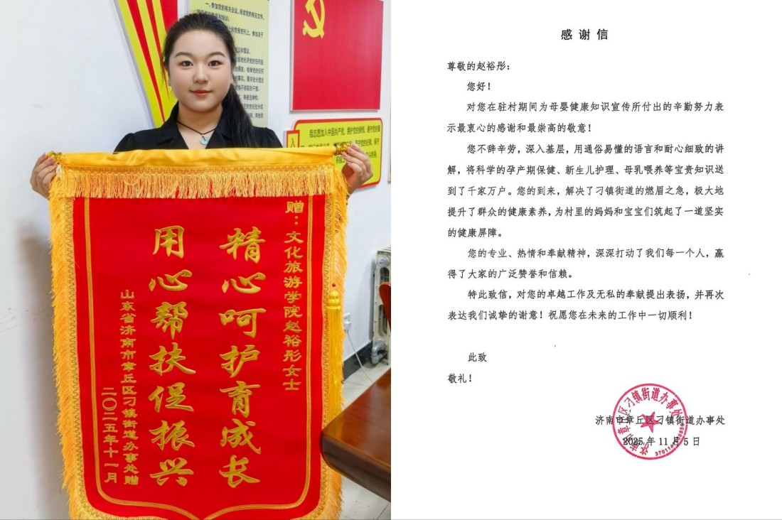 近日,济南市章丘区刁镇街道办事处致信山东商务职业学院,对山东商务职业学院文化旅游学院学生赵裕彤在驻村服务期间的突出表现予以高度赞扬,并对学校在乡村振兴、基层治理工作中给予的支持表示衷心感谢。