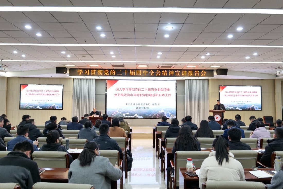 12月15日下午,枣庄职业学院召开学习贯彻党的二十届四中全会精神宣讲报告会。学院党委书记郝荣平以“深入学习贯彻党的二十届四中全会精神,全力推进高水平高职学校建设和升本工作”为题作报告。学院领导张华伟、王念、张蓝兮、闫博、曹先贺出席报告会。各党(总)支部委员、离退休党支部党员代表、全体副科级及以上干部、学生代表参加报告会。学院党委委员、宣传部部长、统战部部长郝艺主持报告会。