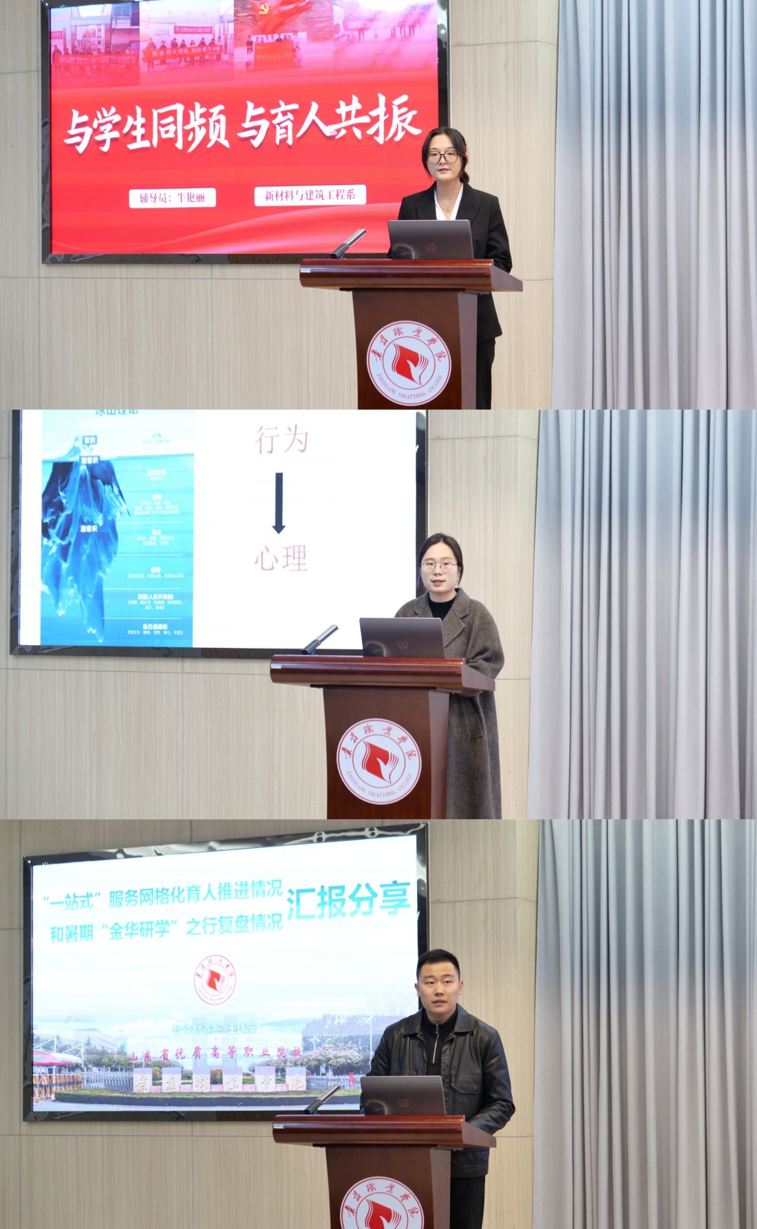 会上,新材料建筑工程系牛艳丽老师、台儿庄古城校区赵哲炜老师、智能制造系王伟航老师分别从技术赋能育人创新实践、用心聚焦心理健康、精细化开展“一站式”服务分享了立足本职岗位的鲜活实践。