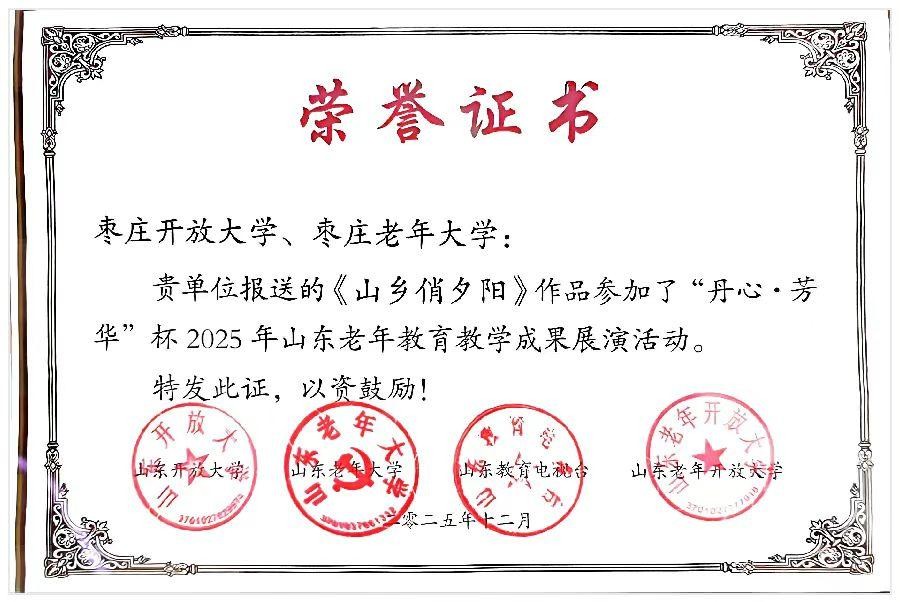 近日,“丹心・芳华”杯2025年山东老年教育教学成果展演活动在山东教育电视台演播厅圆满落幕。由枣庄开放大学与枣庄老年大学联合推送的节目精彩亮相省级舞台,赢得现场观众的热烈掌声与广泛好评。